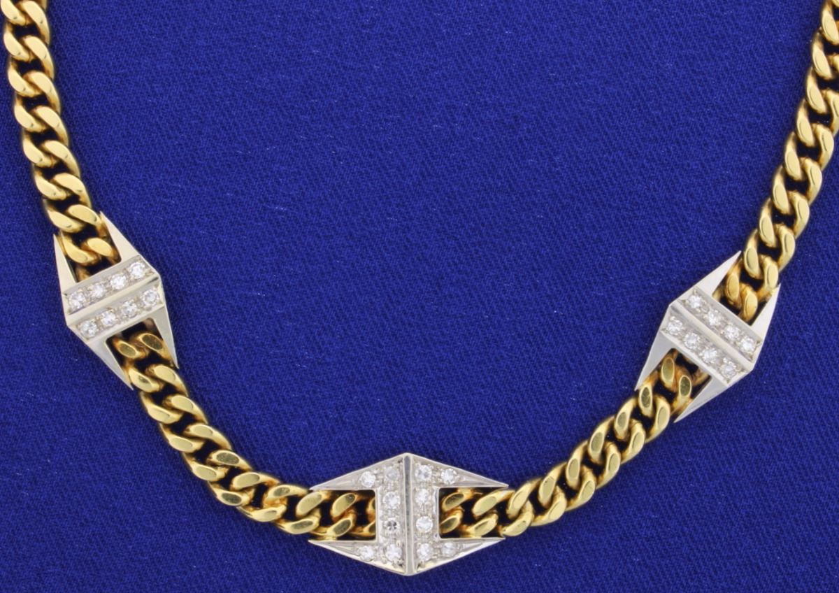 The 18K yellow & white gold custom designed necklace contains 1/2ct total weight of high quality VS clarity/F color diamonds. The chain is 5.3mm wide and 15.5 inches long and has a safety clasp. 45.7g