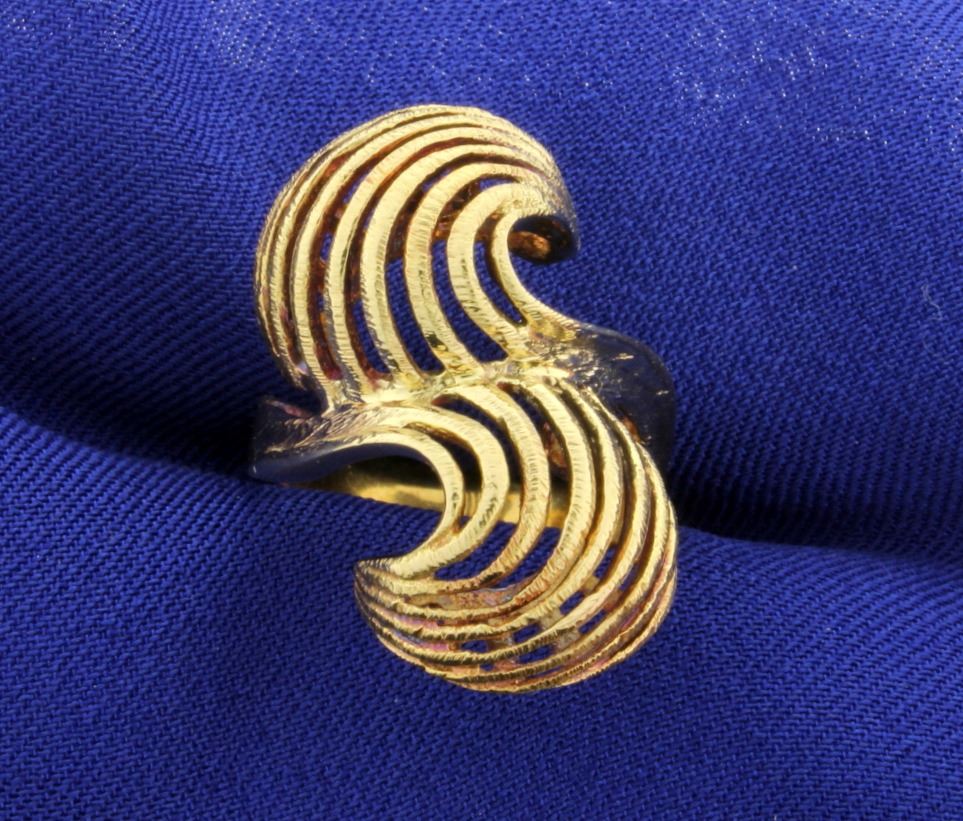 In 18K yellow gold, this ring has a very unique design, it is stamped Italy 750. Size 7 3/4 10.2g