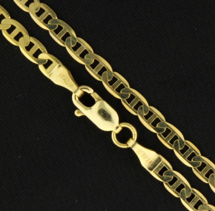 10K yellow gold, it is 3.3mm wide. 7.4g
