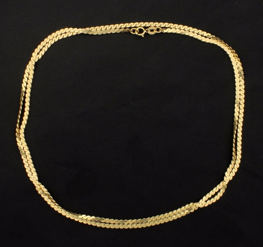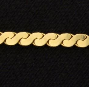 The chain is 14K yellow gold, it has flat "S" shaped links, and is 6.5mm wide. 12.2g