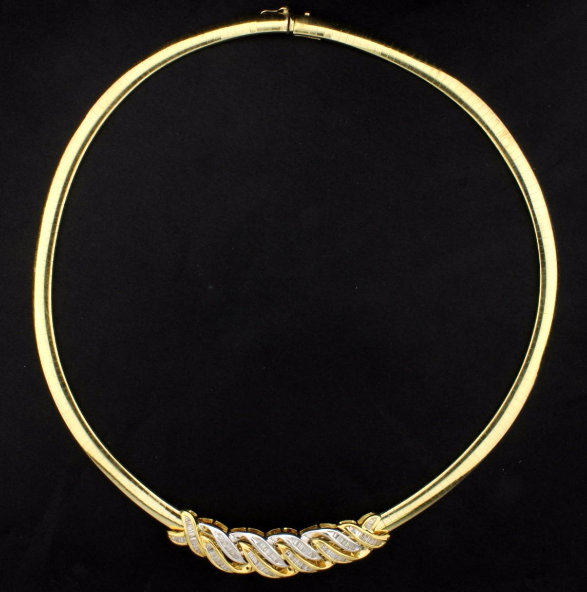 In 14K yellow and white gold, the necklace is 18 inches long, 6mm wide and has a safety clasp. It contains ninety eight baguette diamonds, totaling in 4cts, the diamonds are SI clarity, G/H color. 55.9g