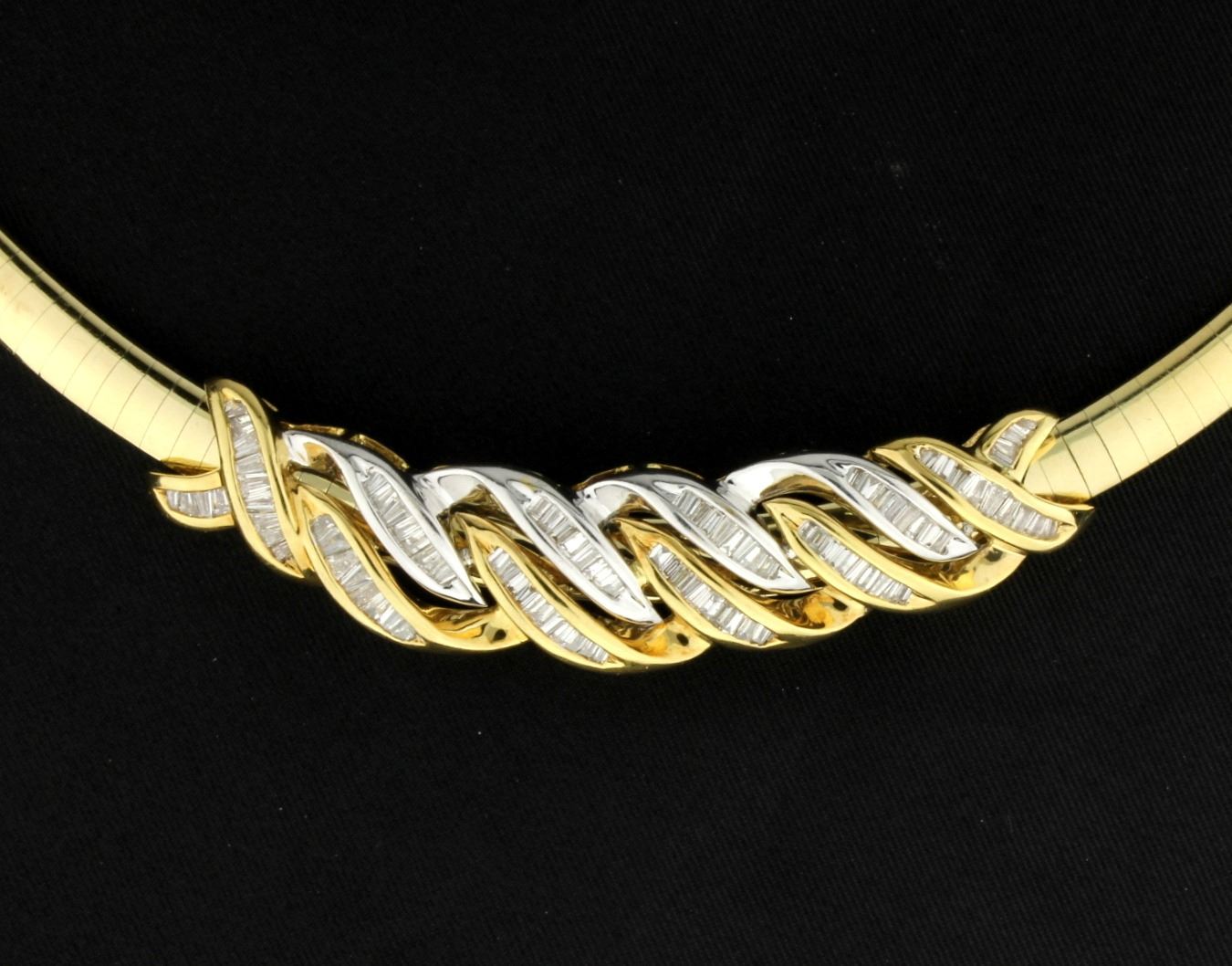 In 14K yellow and white gold, the necklace is 18 inches long, 6mm wide and has a safety clasp. It contains ninety eight baguette diamonds, totaling in 4cts, the diamonds are SI clarity, G/H color. 55.9g