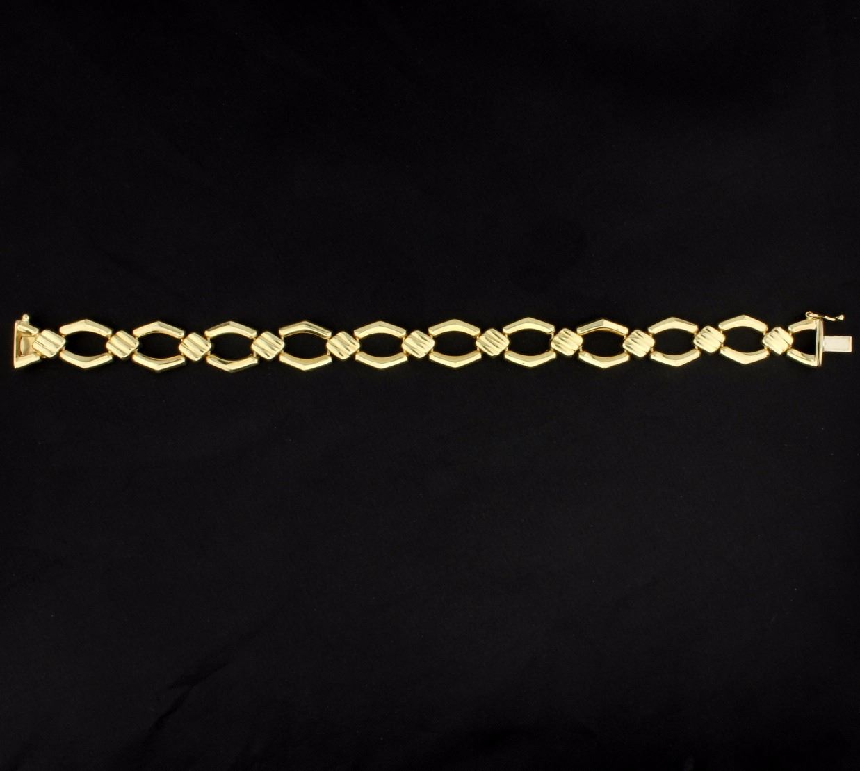 In 14K yellow gold, the bracelet is 11.2mm wide. It has a safety clasp. 12.6g