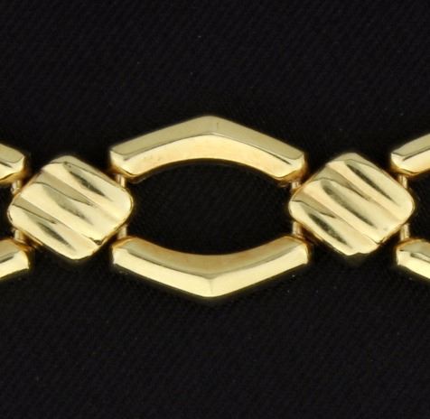 In 14K yellow gold, the bracelet is 11.2mm wide. It has a safety clasp. 12.6g