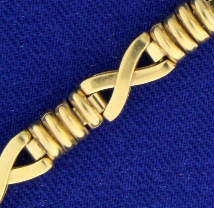 In 14k yellow gold. 5mm thick with safety clasp. 10.7g.