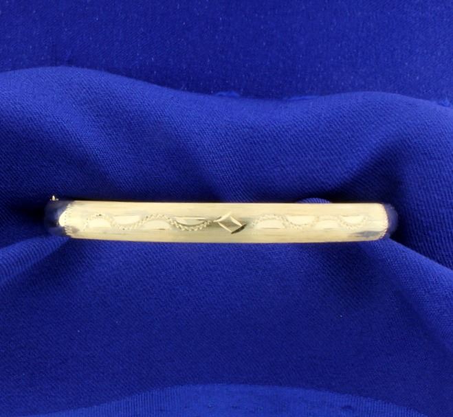 In 14K yellow gold, the bangle is 2 1/2 inch in diameter and has a very unique pattern. 11.2g