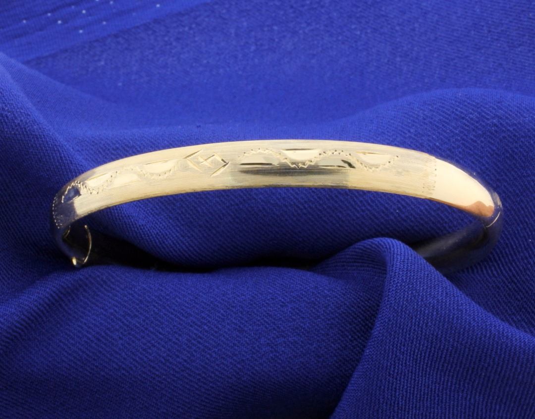 In 14K yellow gold, the bangle is 2 1/2 inch in diameter and has a very unique pattern. 11.2g