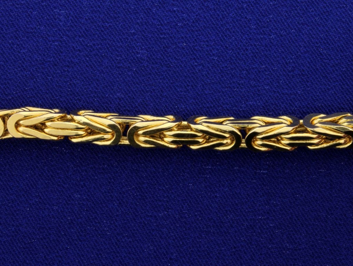 14K yellow gold, the bracelet is 5.8mm thick and 8 1/2 inches long. It is in excellent condition. 48.6g