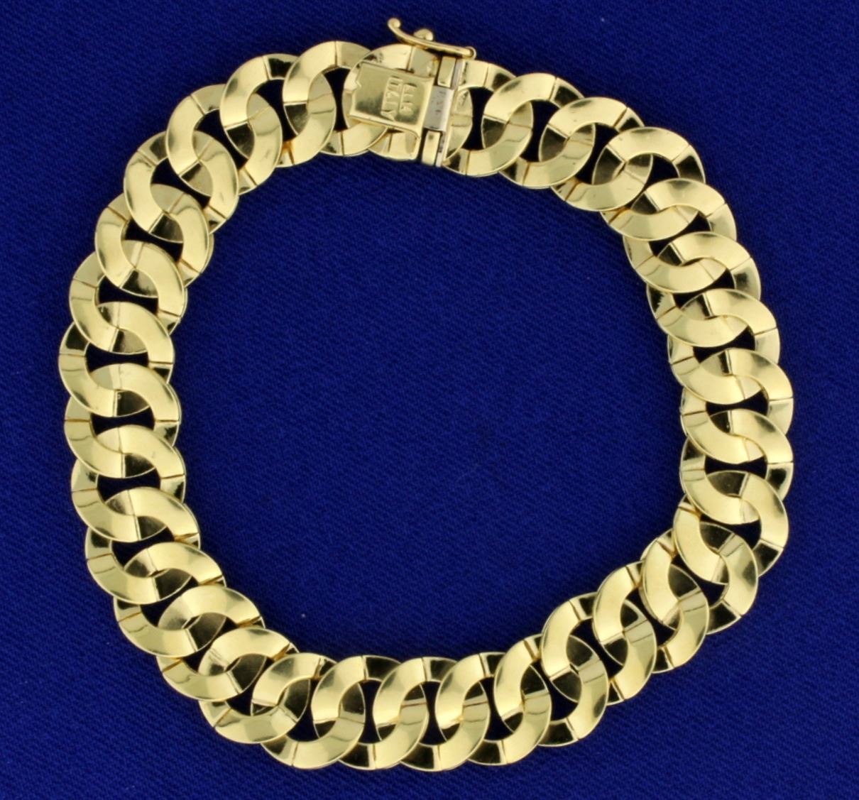 In 14k yellow gold. 7 1/4" long and 10.5mm wide with safety clasp. 25.4g.