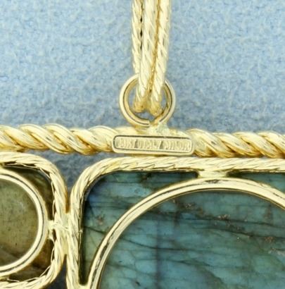 In 14K yellow gold. This pendant contains two 19mm & four 8mm square hand crafted stained glass artwork. It is 2 1/4 inches long with the bale.            12.6g