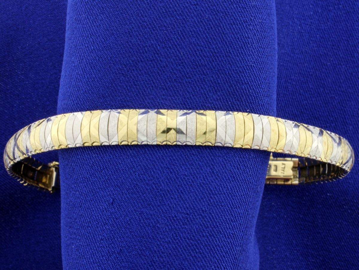 In 14K yellow & white gold, it is 7 1/2 inches long and 8mm wide. Great diamond cut design! With a safety clasp. 16.8g