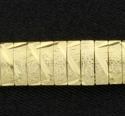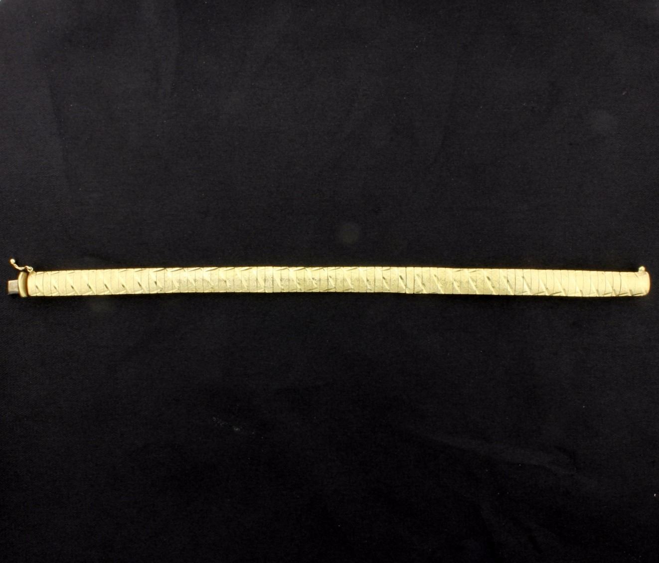 In 14K yellow gold, with intricate etching on band, it is 7 1/4 inches long with safety clasp. 15.0g