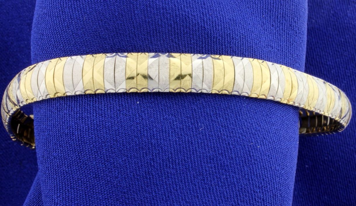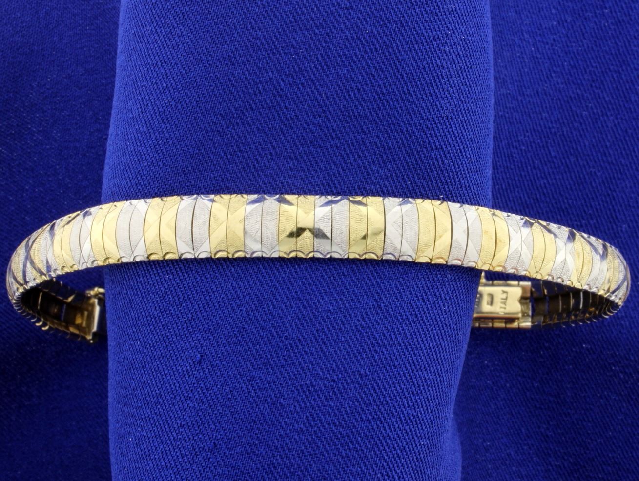 In 14K yellow & white gold, it is 7 1/2 inches long and 8mm wide. Great diamond cut design! With a safety clasp. 16.8g