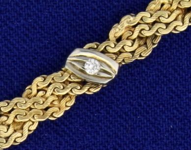 In 14k yellow and white gold, containing seven high quality .01ct diamonds SI clarity/H color. 5mm wide with safety clasp. 10.5g.