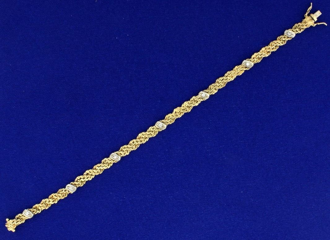 In 14k yellow and white gold, containing seven high quality .01ct diamonds SI clarity/H color. 5mm wide with safety clasp. 10.5g.
