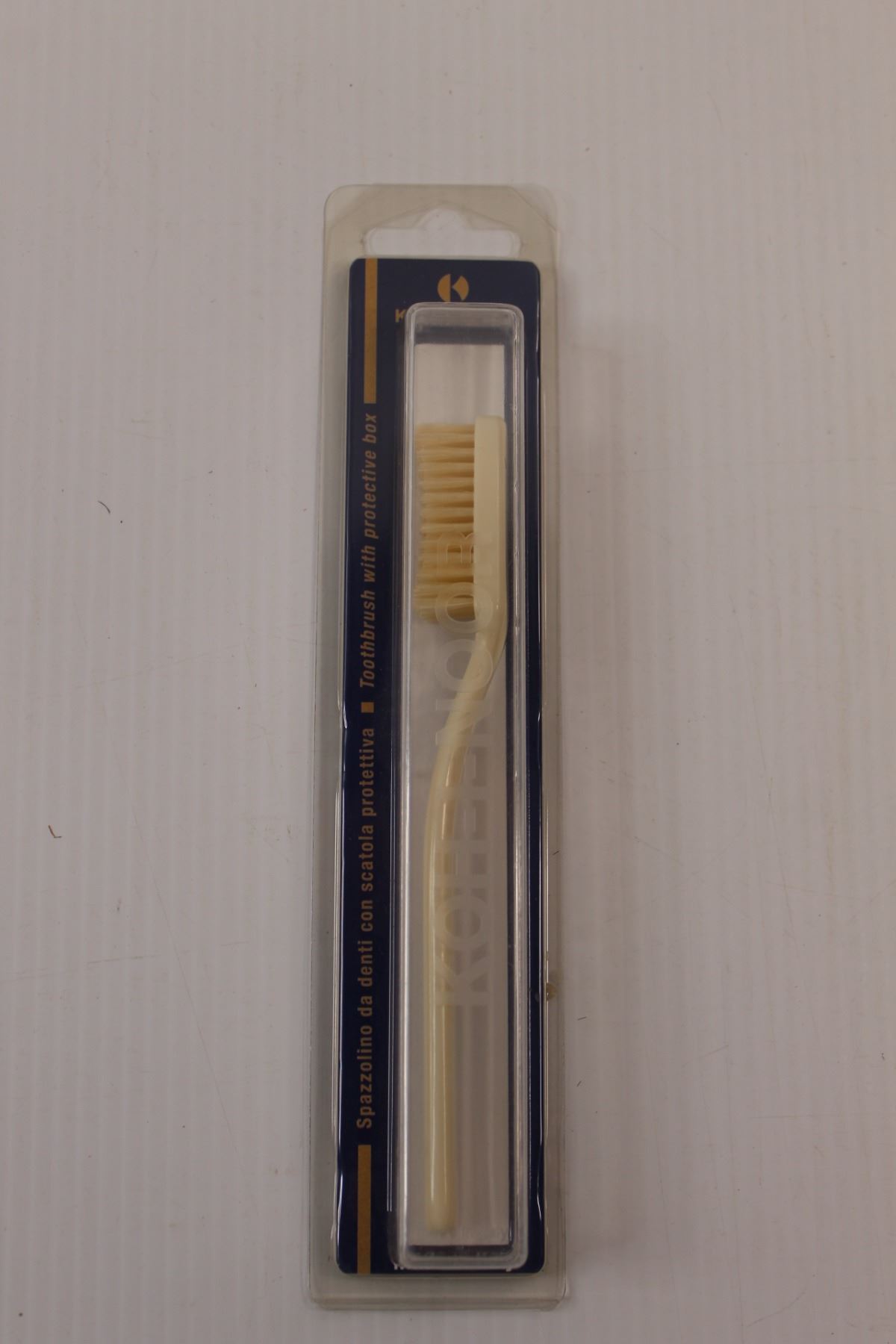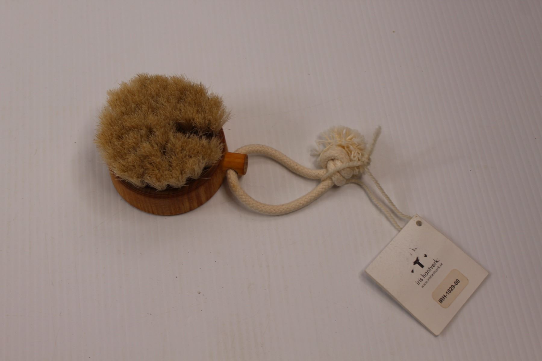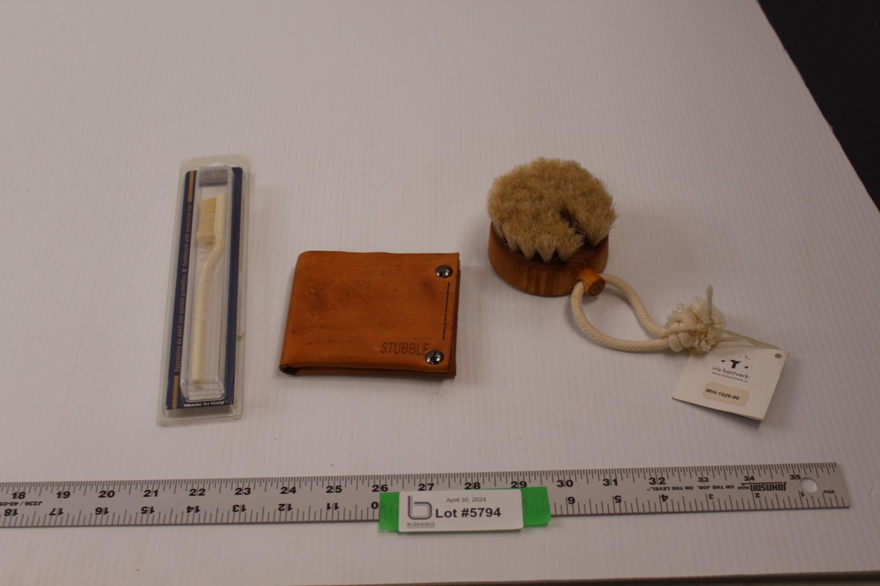 Italian Made KOH-I-NOOR Tooth Brush w/Protective Box, Stubble Leather Wallet & Iris Hantverk Shower Brush w/Wood Handle, Natural Hair Bristles (All New w/Tags & NIB)