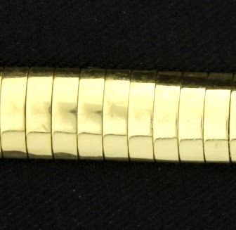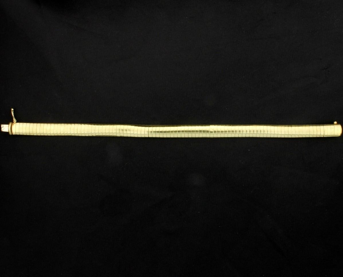 It is 10K yellow gold and is 7 inches long and 7mm wide. It has a safety clasp. 12.3g