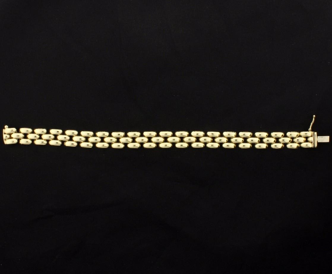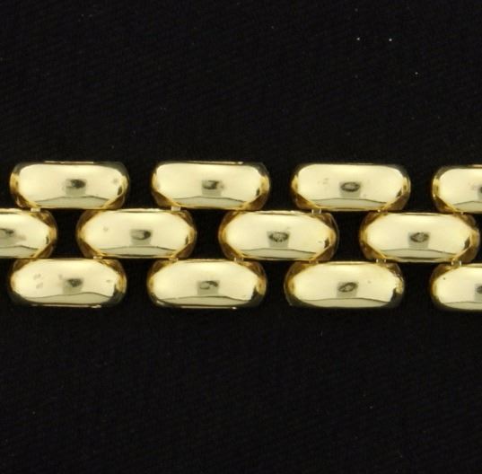 In 14K yellow gold this bracelet is 7 1/2 inches long and 9.4mm wide. 14.7g