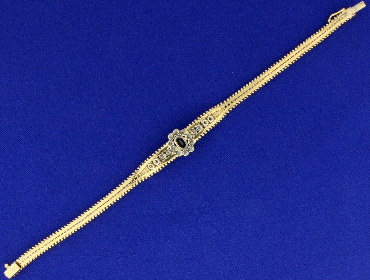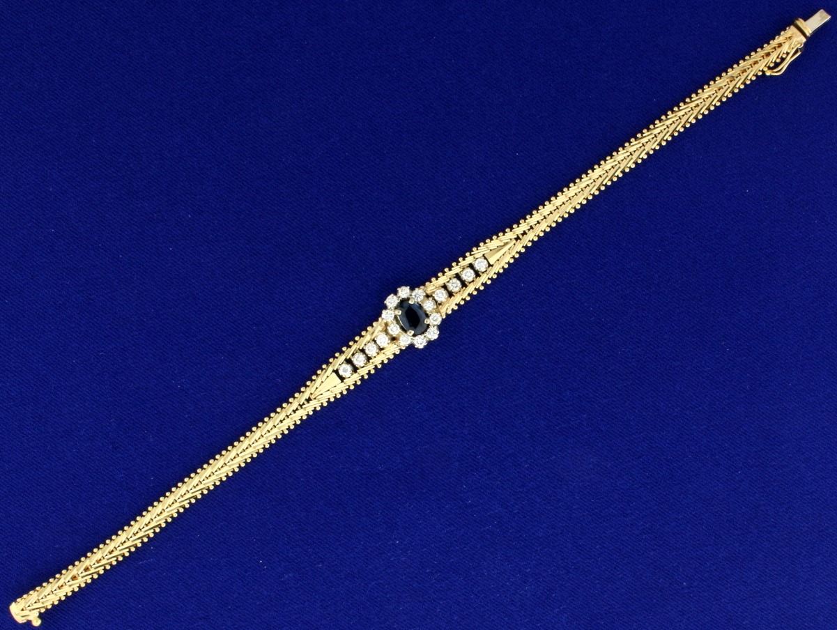 In 14k yellow gold. Contains a natural oval cut high quality 1ct sapphire with vivid blue color and excellent clarity. It is surrounded by 3/4 ct TW high quality diamonds, SI1 clarity/G color. 7 1/2" long with safety clasp. 17.3g.