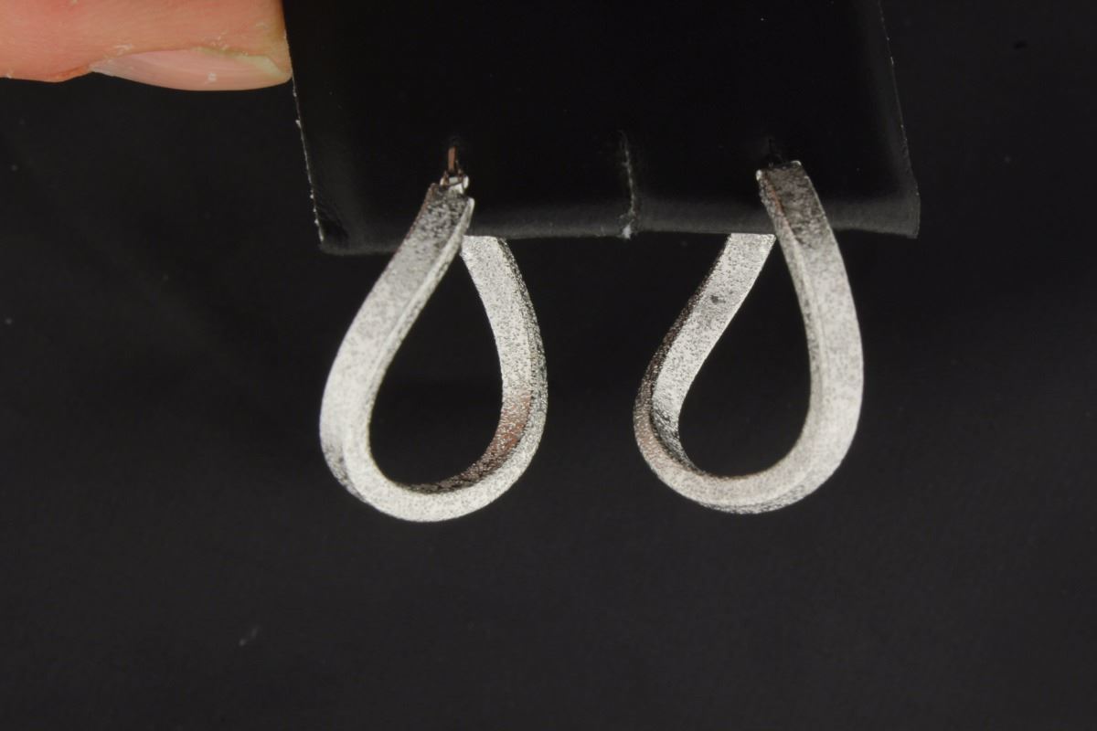 In 14k white gold these earrings have a twisted hoop design and textured finish. They are 1 inch long 2.1g