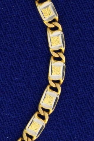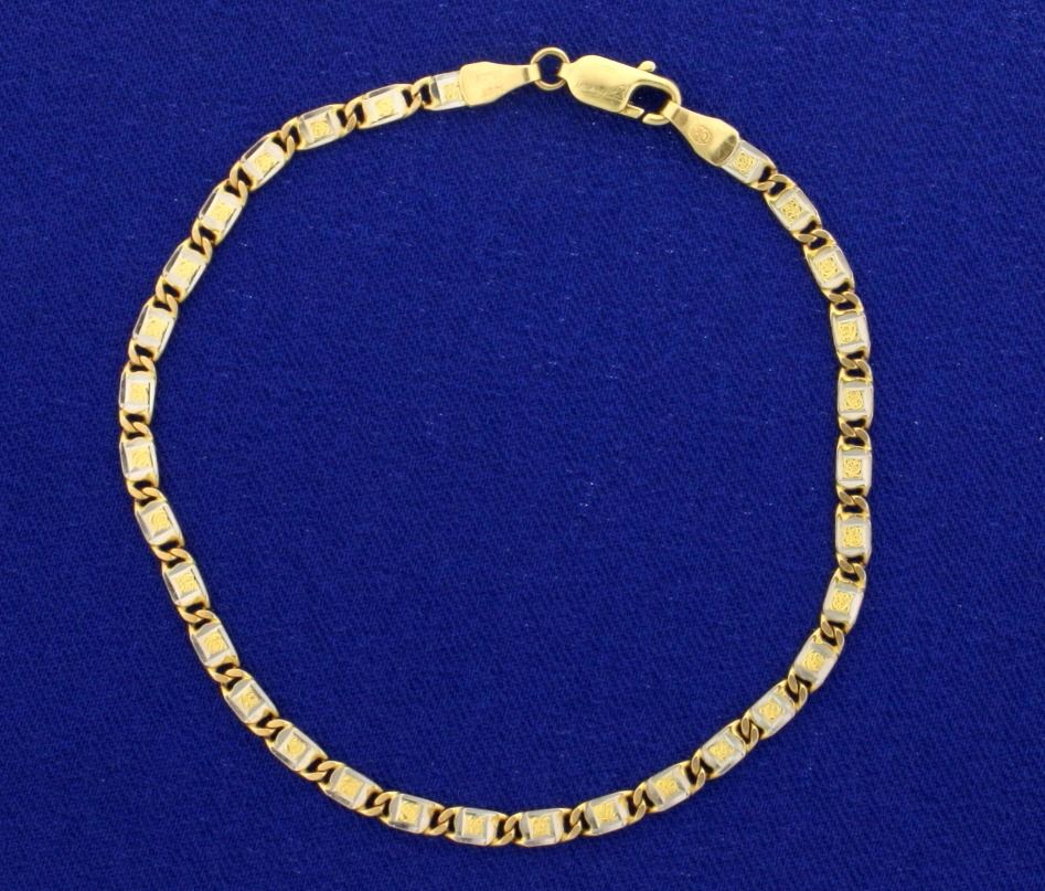 In 14k yellow and white gold. 7 1/4 inches long and 2.8mm wide with lobster clasp. 4.0g.
