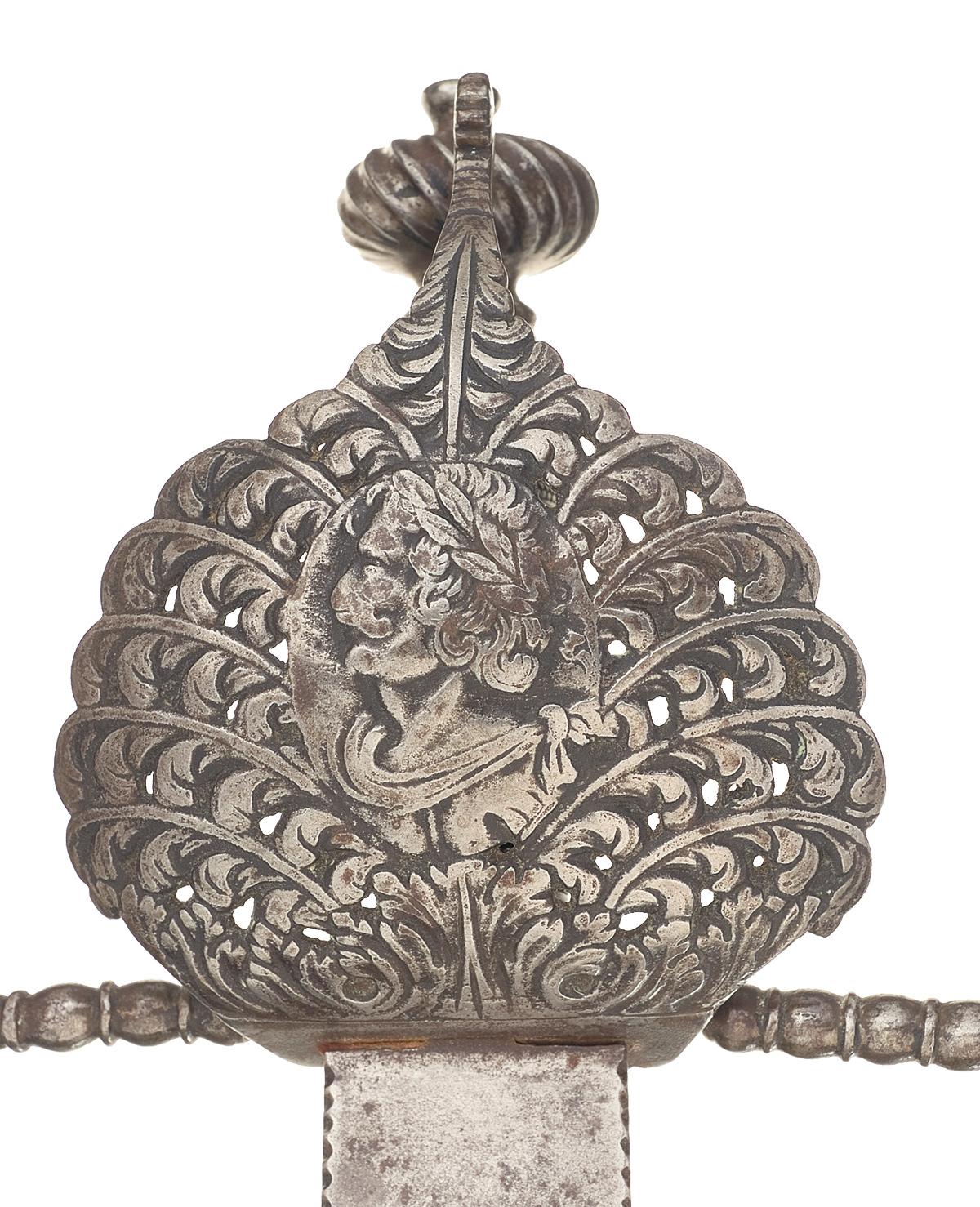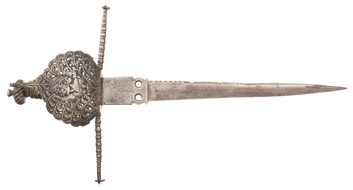 14 1/4" blade, with file work along the spine, a pair of pierced holes in the long ricasso, with additional chiseling on the sides and a thumb rest groove on the rear. 10 1/4" wide crossguard with a twist pattern and floral quillions, twisted wire grip, round pommel and a knuckleguard with pierced chiseling showing a man's head. OAL: 19 1/2"