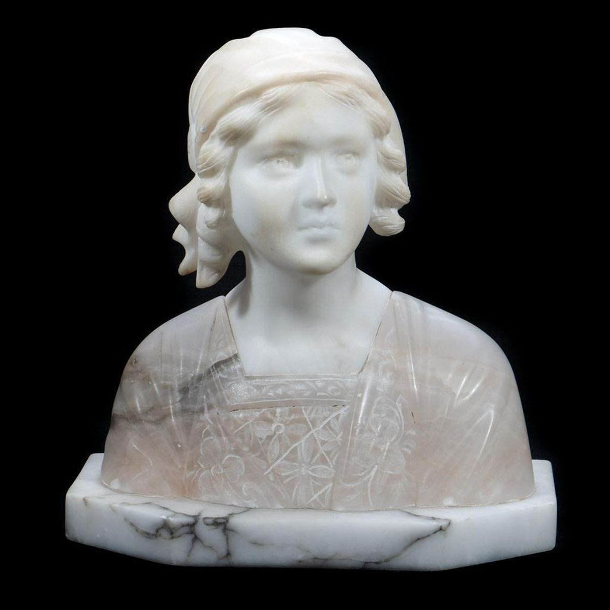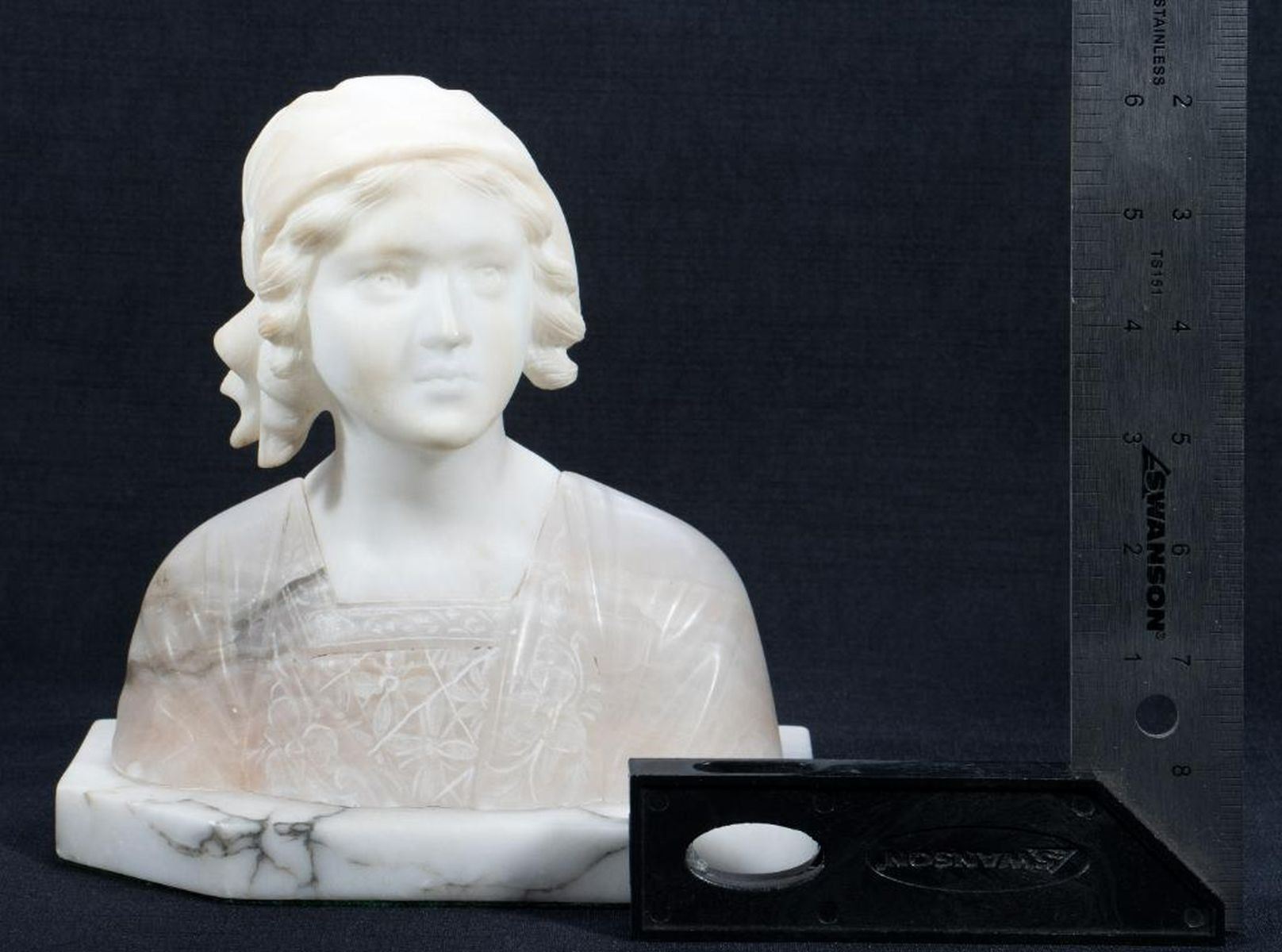 The woman in white and veined marble (slightly rose-toned), wearing a square-necked bodice with carved floral design, her headscarf secured with a brooch at the side. On a slab base, carved: "Made in Italy." 7 1/2in. h. x 7in. w. x 4in. d. Condition: Good; some staining/soiling to head/face.