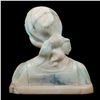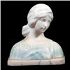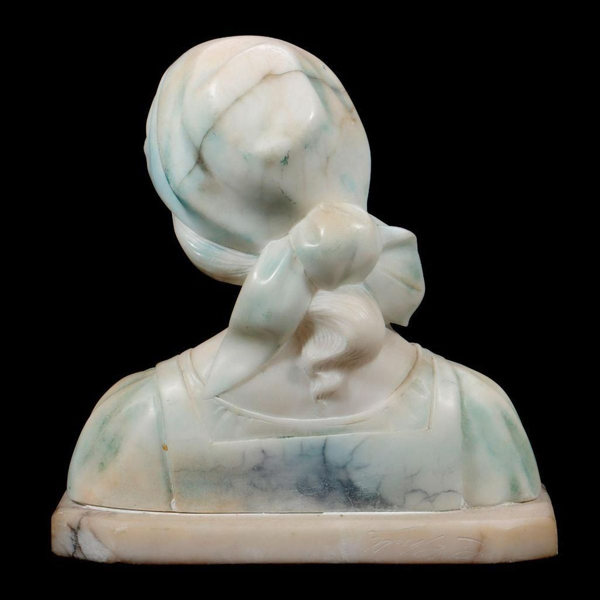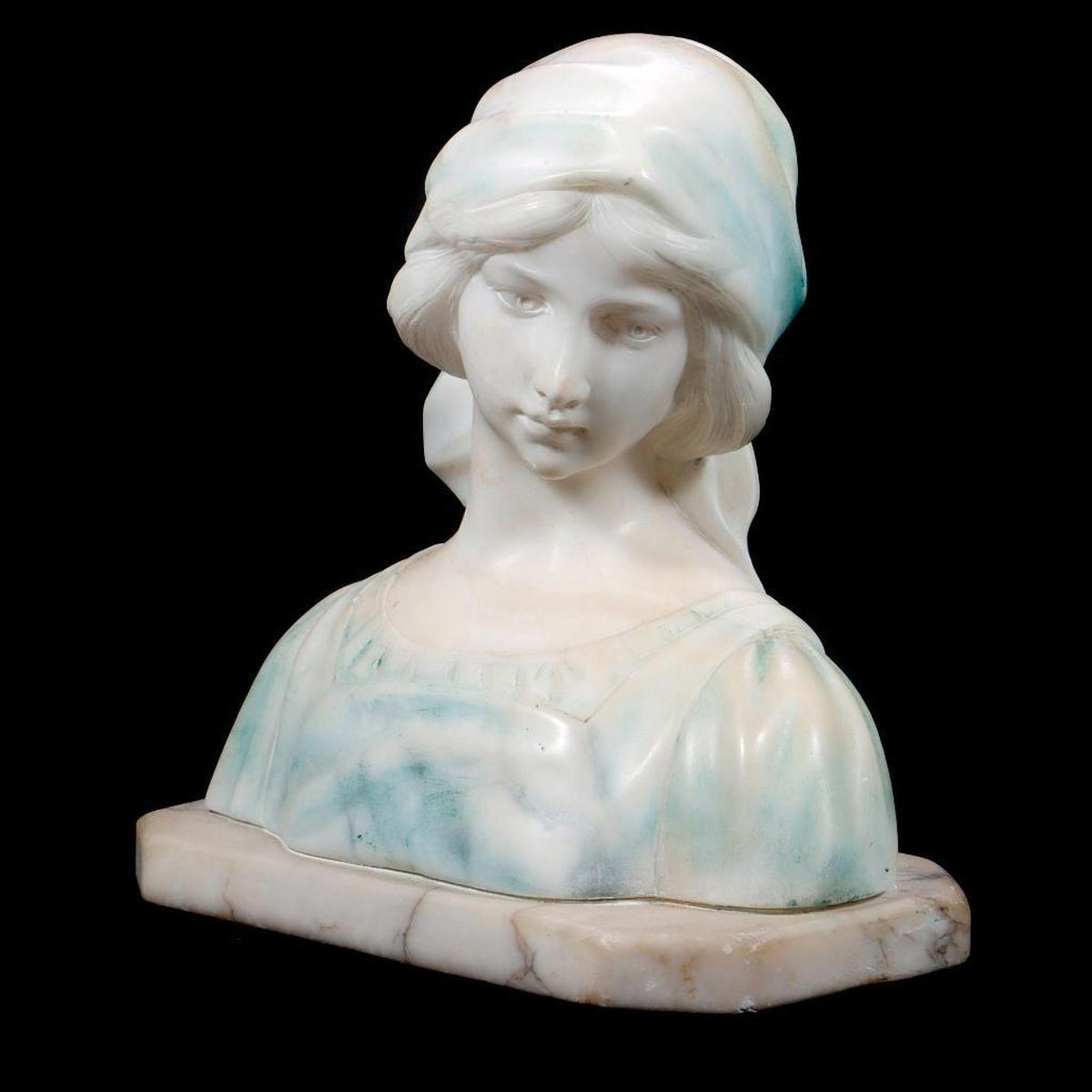 The woman in white and veined marble, wearing a bow-tied headscarf; on a slab base. 8 1/2in. h. x 8 1/4in. w. x 4 3/4in. d. Condition: There is a horizontal crack across the back of the head. At one time the scarf and bodice were patinated blue, with only traces of the pigment now remaining; some staining/soiling to head/face.