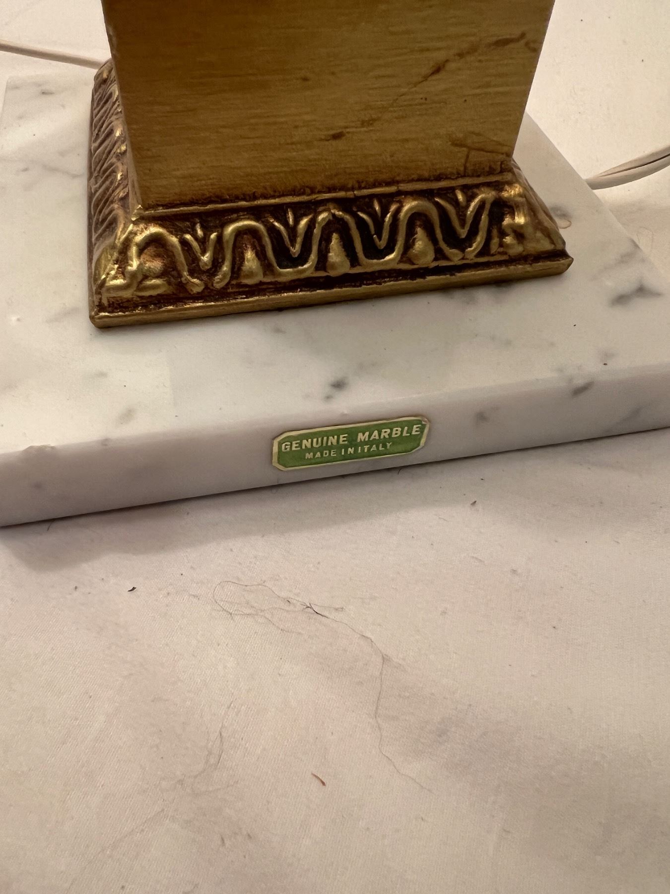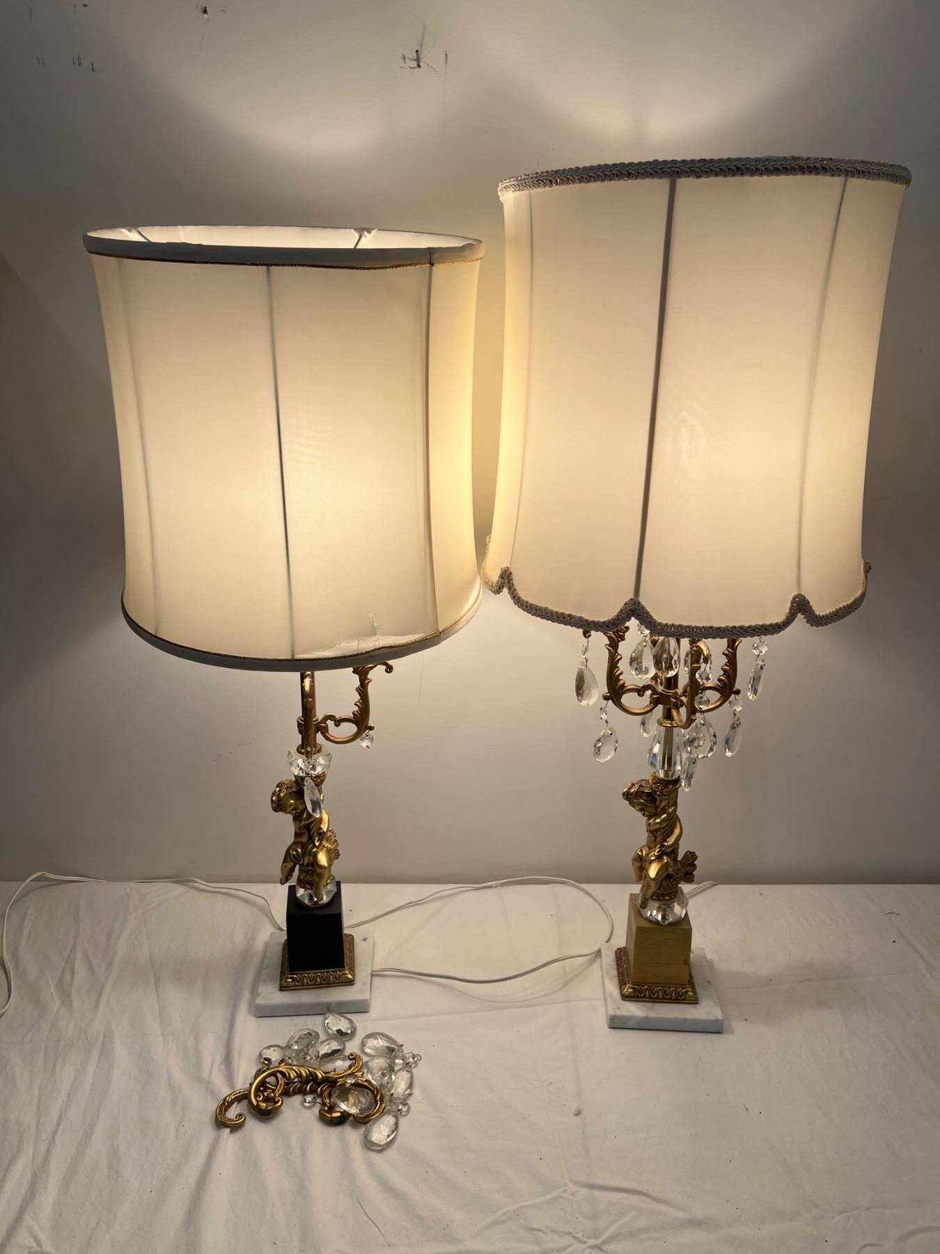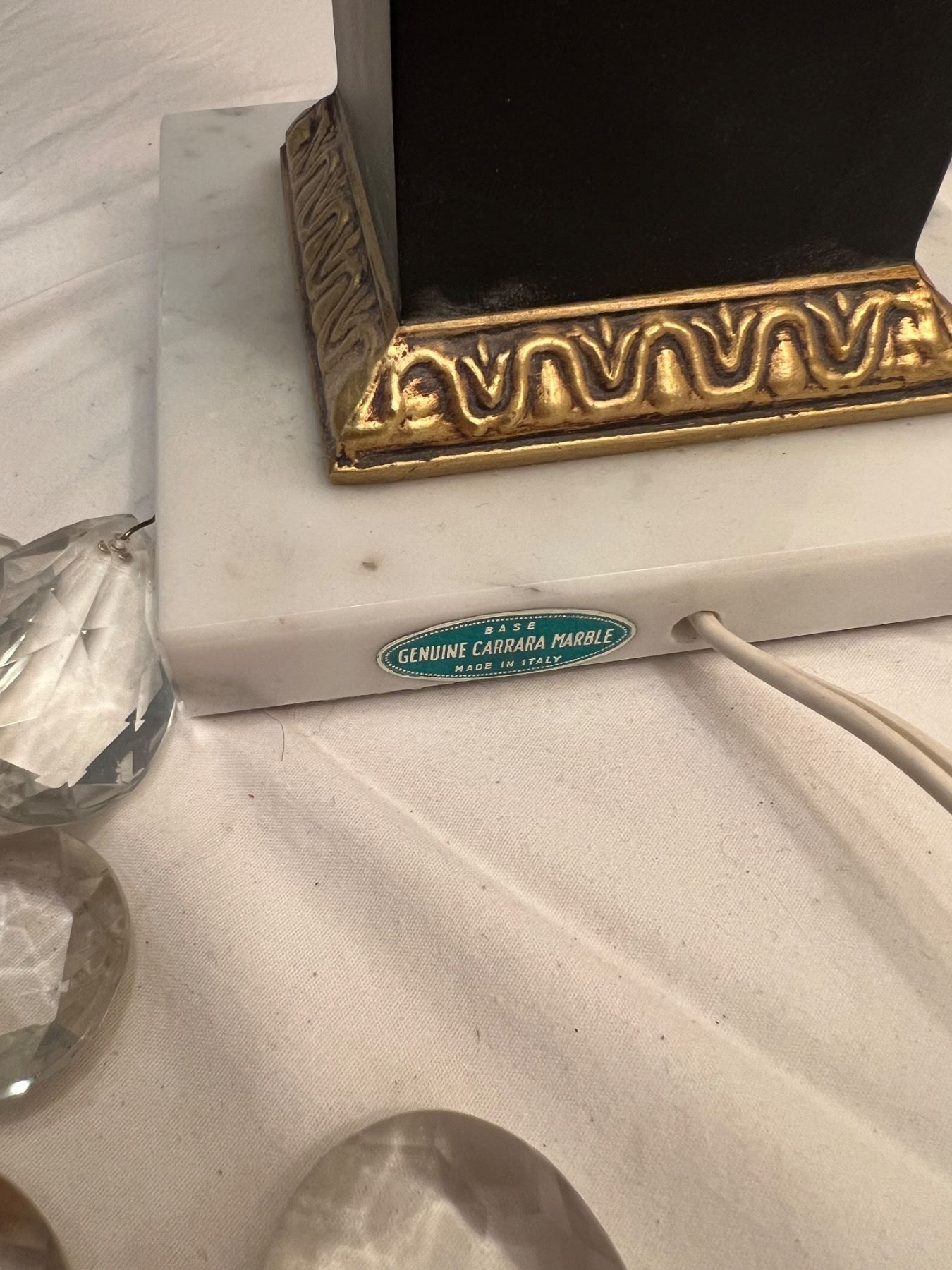 Bases only are made from marble. Black lamp has two of the adornments broken off and included with this lot. Taller lamp stands 35" in height and 14" diameter for lamp shades.