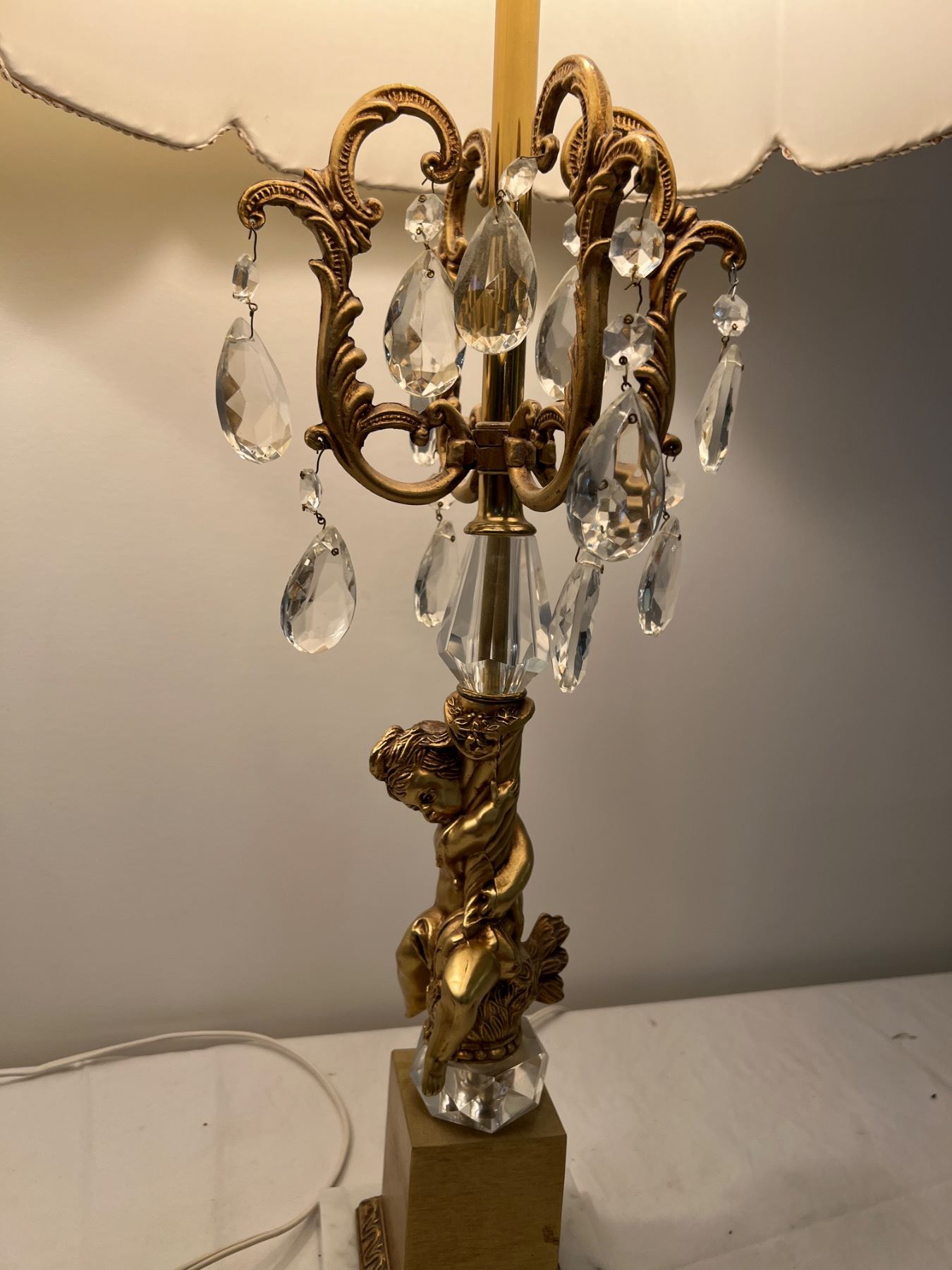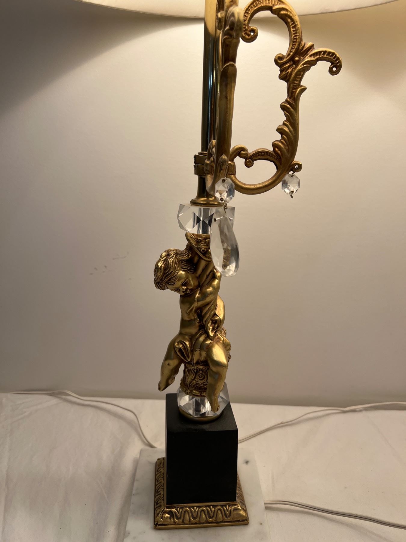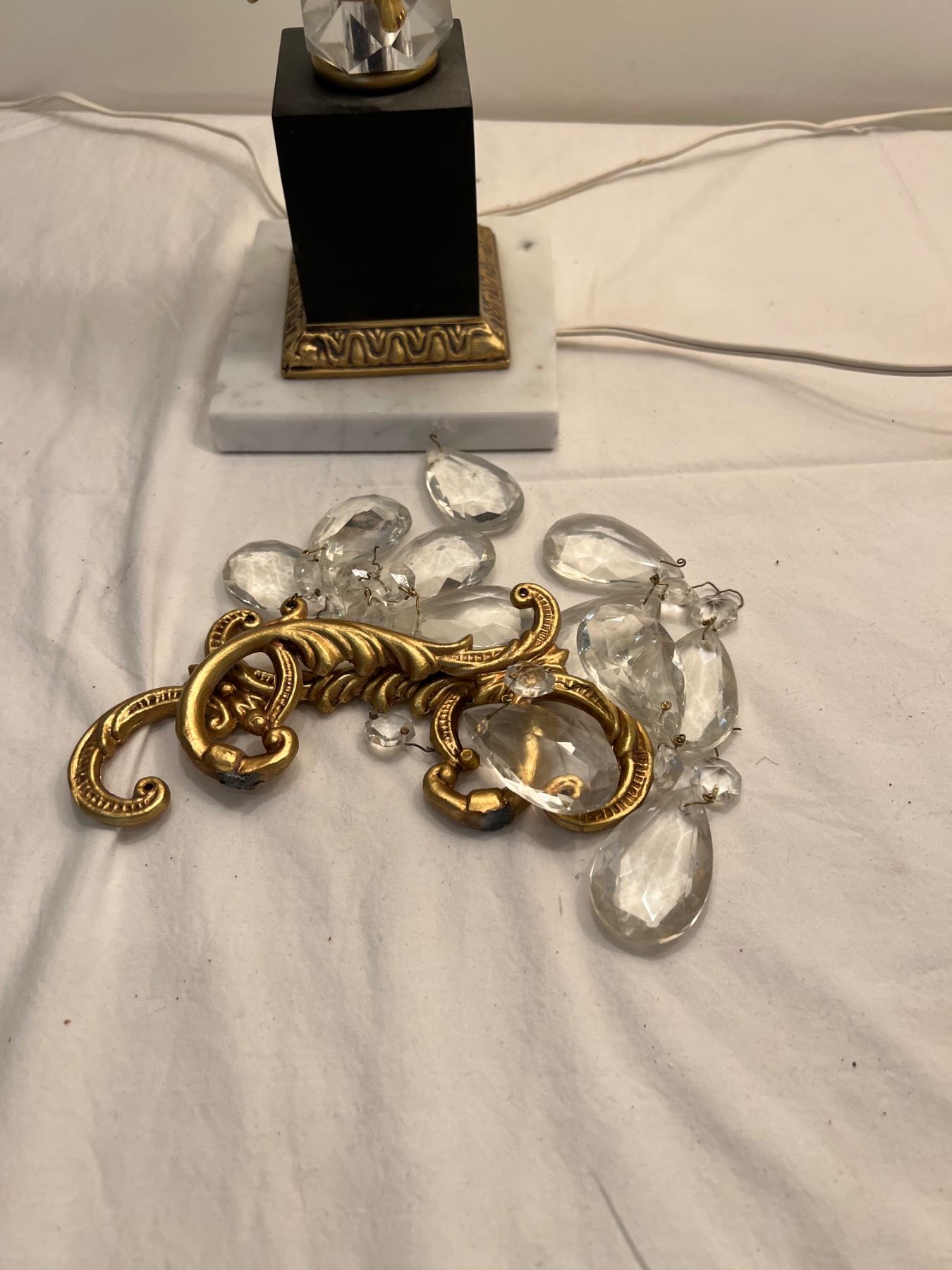 Bases only are made from marble. Black lamp has two of the adornments broken off and included with this lot. Taller lamp stands 35" in height and 14" diameter for lamp shades.
