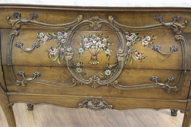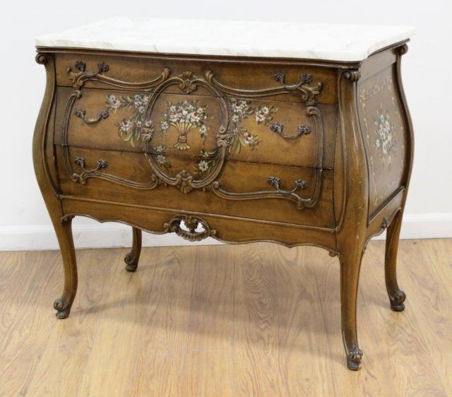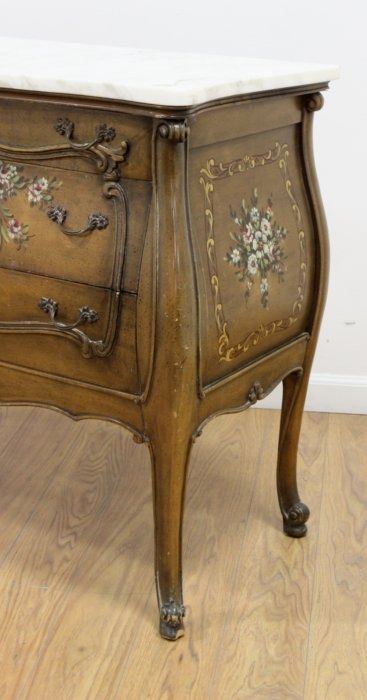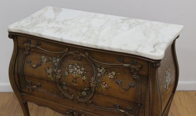 With painted decorations. Bombe sides. White marble. Approx. 31" H x 37" W x 19" D.