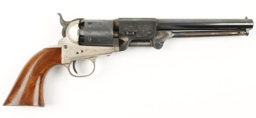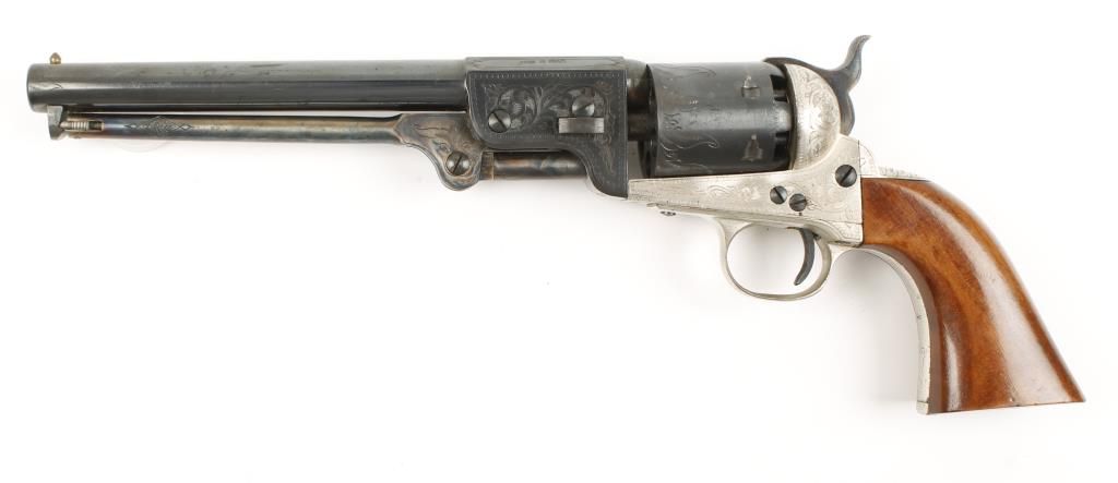 Italian copy of a Colt Navy with 7-1/2" round barrel. Blued finish with silver alloy frame, case colored hammer and loading rod and smooth wood grips. Scroll engraved and top of barrel marked "F.A.R.A." Condition: Very good showing little use.