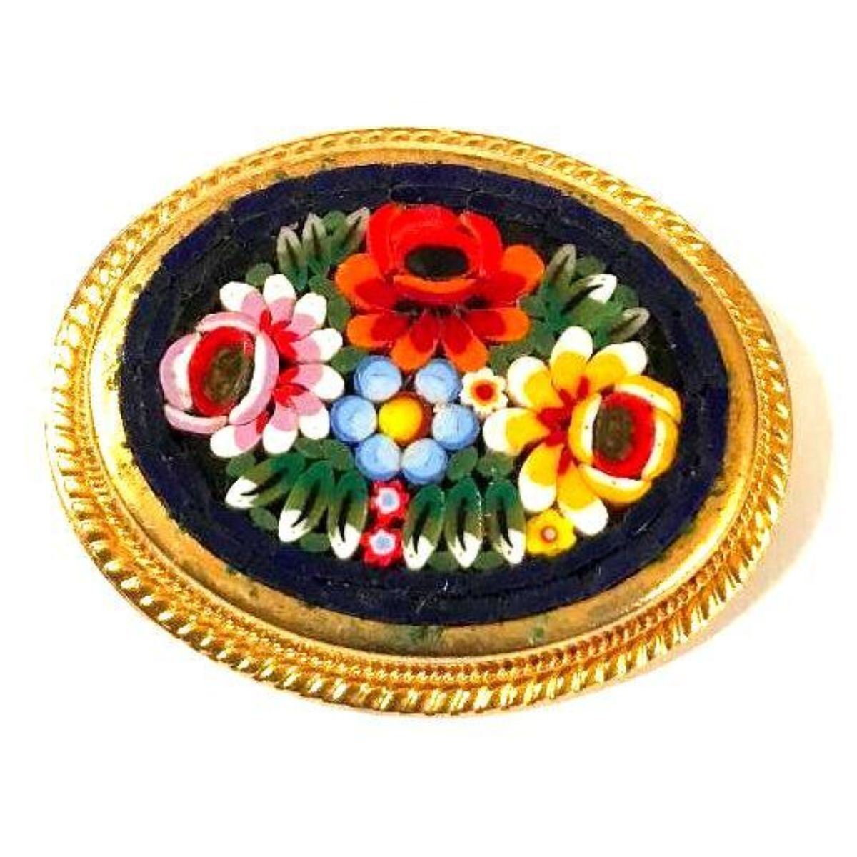 Ornate gold tone metal frame surrounding Italian micro mosaic floral scene. 1 3/4" W X 1 1/4" L.Â