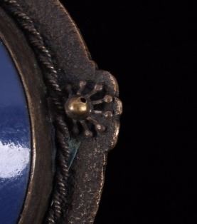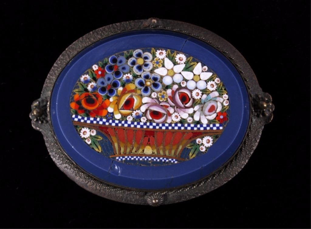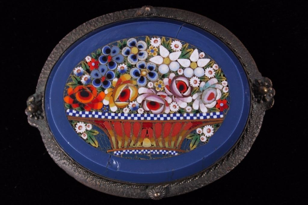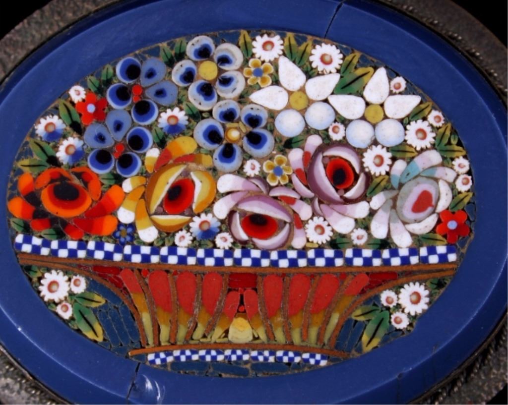 This is an Italian micro mosaic inlaid floral design on a silver like brooch or pin. The front has an excellently detailed floral in vase design. The blue carved stone shows a crack, but is a solid piece. This is from the mid 19th century. Measures 1.75"x2.25".