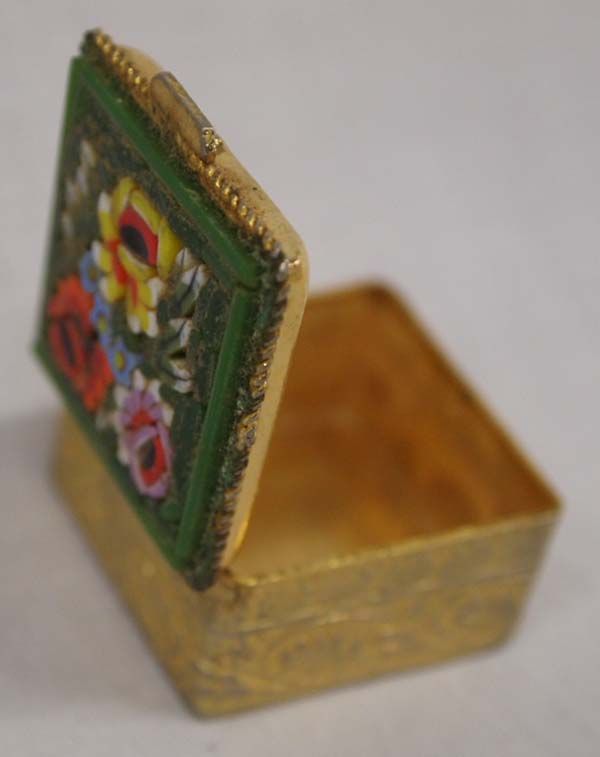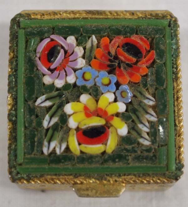 Italian Micro Mosaic Pill Box. Floral design on lid, measures 1'' x 1''.