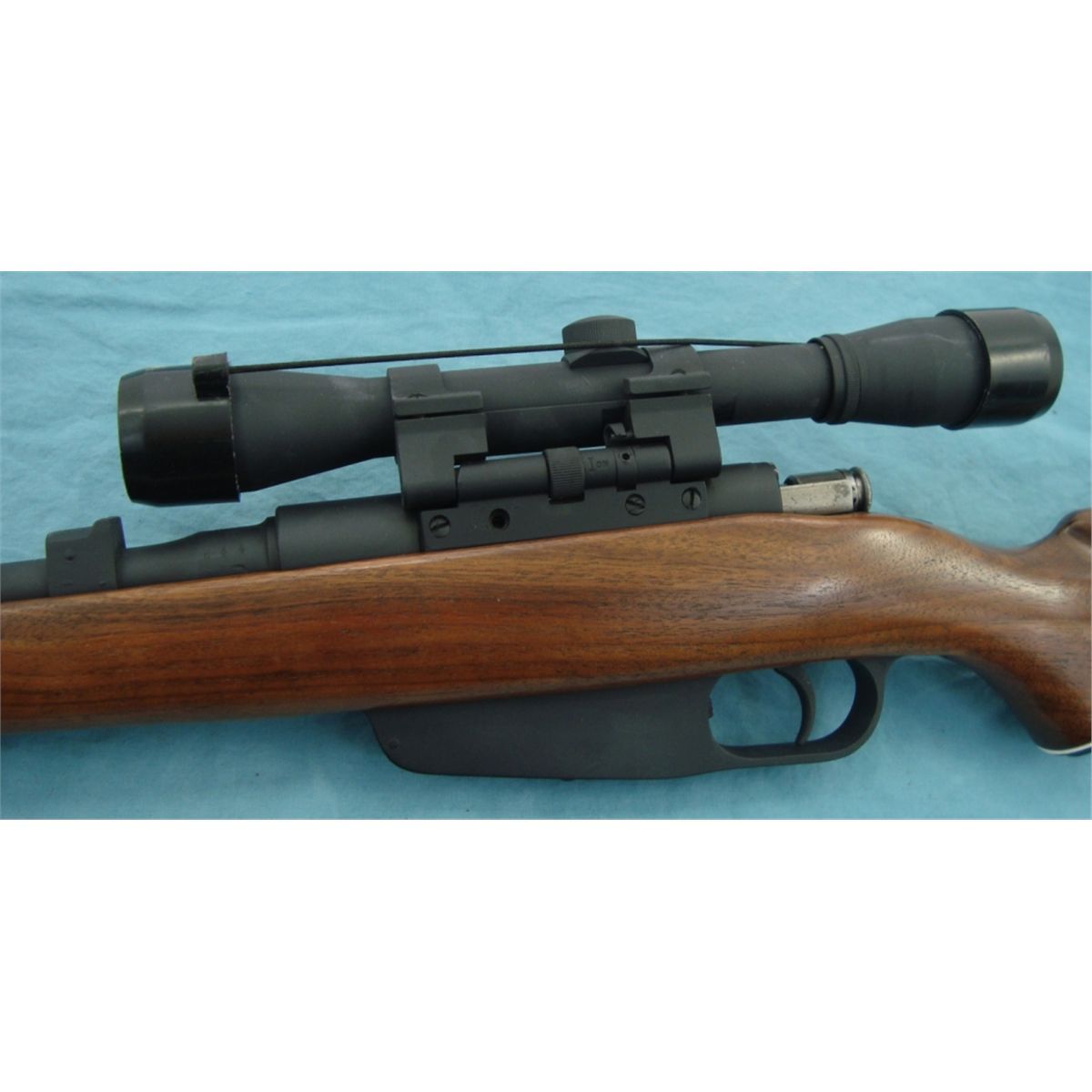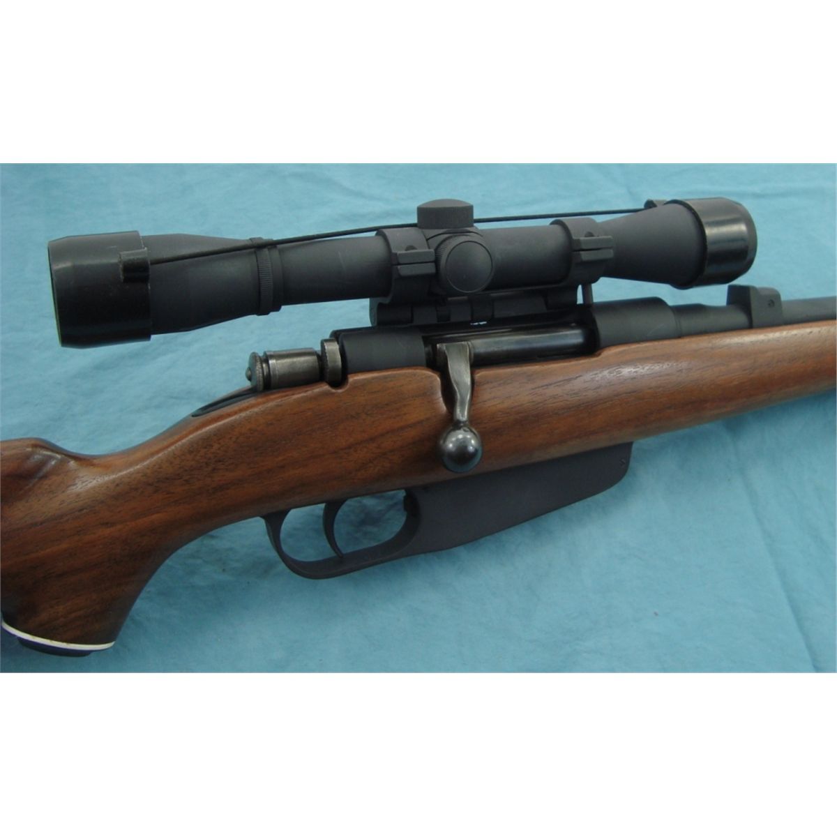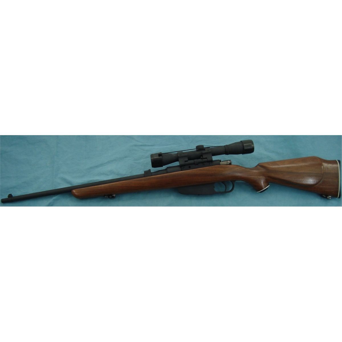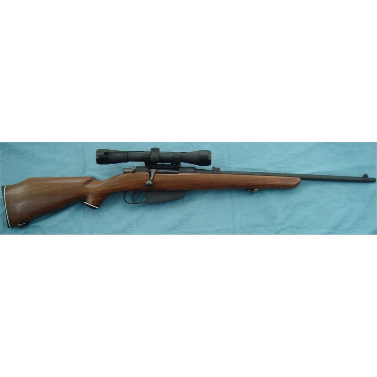#13859; 7.35 w/approx 21" bbl. & tip off style scope & sporterized stock. Metal appears to have a black dura coat style finish. Will be selling w/30 rnds of 7.35 Italian ammo.