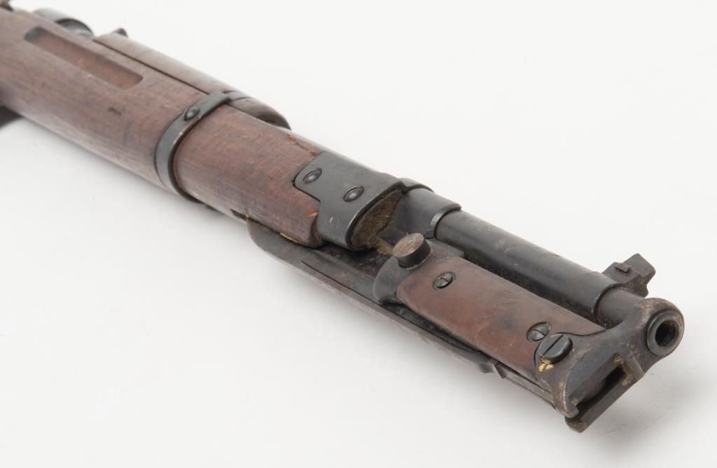 Italian Model 1938 Carcano in 7.35mm caliber remaining in very good plus original condition with folding bayonet, serial number S1547 showing Terni Arsenal markings. The carbine retains 90% to 95% original blue under a of coating of oil andgrease which would clean well. The stock is very good plus showing a good cartouche and markings with some minor dings, mars and scratches. The breech is dated 1939. The action is good and the bore is at least good but coated with oil andgrease. A far better than average specimen. Est.: $100-$300