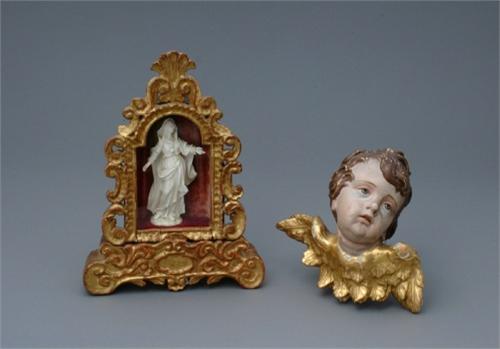 19th century <BR> The carved wood bust length figure with polychrome painting and parcel gilding, minor looses. <BR> Height 7.5in <BR>