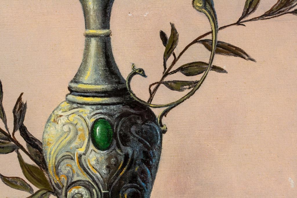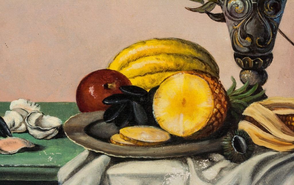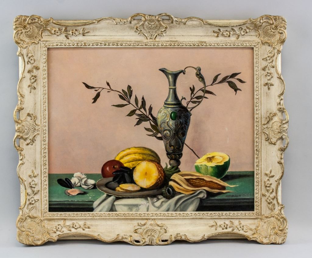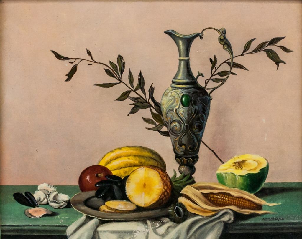 Oil on canvas, framed. Featuring still-life scene with fruit and a slender and ornate vase. Signed "ADRIANO Gajoni" in the bottom right corner. Biography of artist attached to verso, bottom right corner of the biography has been damaged. 39 x 50 cm (15 x 20 in), Frame: 54 x 66 cm (21 x 26 in).