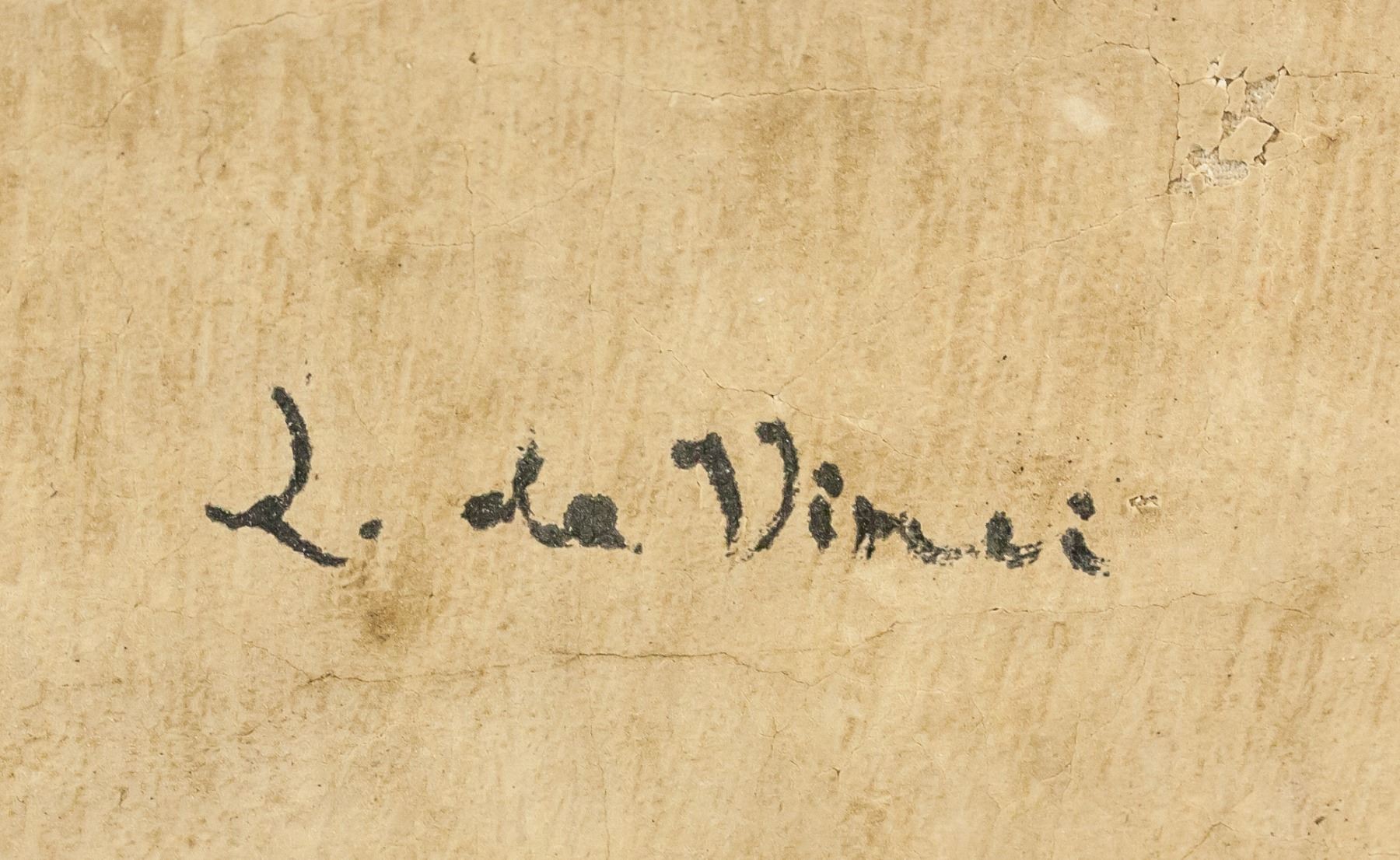 Oil on canvas. Featuring sketch portrait of a woman's face. Signed "L. da Vinci" in the bottom right corner. "TO Louis [Illegible] PARIS" stamped on verso. Attributed to Leonardo da Vinci (1452-1519, Italian). 50 x 38 cm (19.5 x 15 inches).