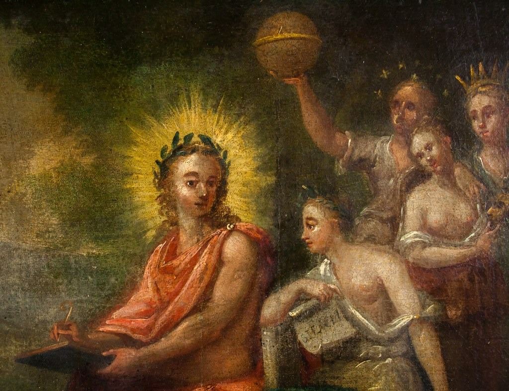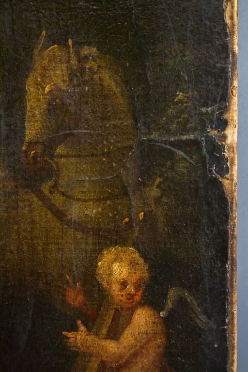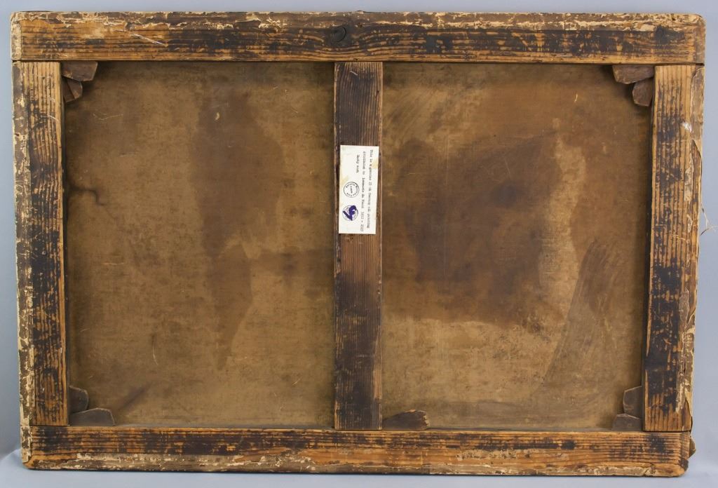 Oil on canvas. Featuring a biblical landscape scene. Label affixed to verso inscribed "This is a genuine 15 th Century oil painting. Attributed to Leonardo da Vinci 1452 - 1519 / Early work". Two stamps on label inscribed Galerie Mathias Fels. 56 x 83 cm (22 x 32.5 in)