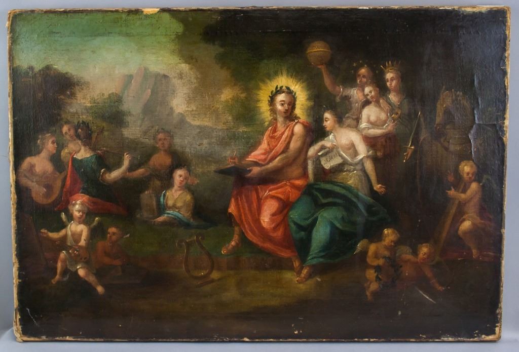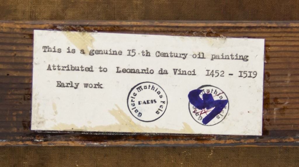 Oil on canvas. Featuring a biblical landscape scene. Label affixed to verso inscribed "This is a genuine 15 th Century oil painting. Attributed to Leonardo da Vinci 1452 - 1519 / Early work". Two stamps on label inscribed Galerie Mathias Fels. 56 x 83 cm (22 x 32.5 in)