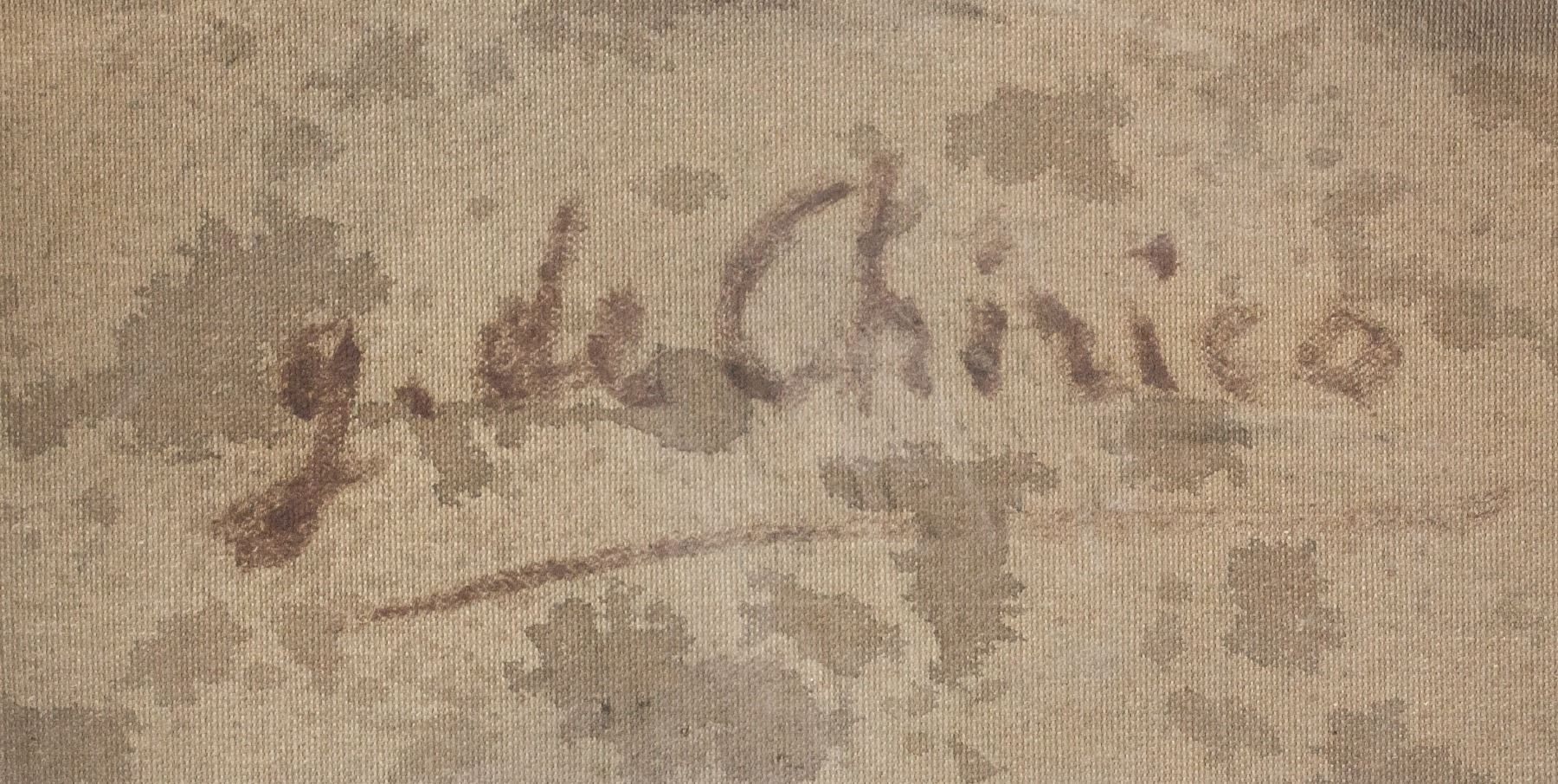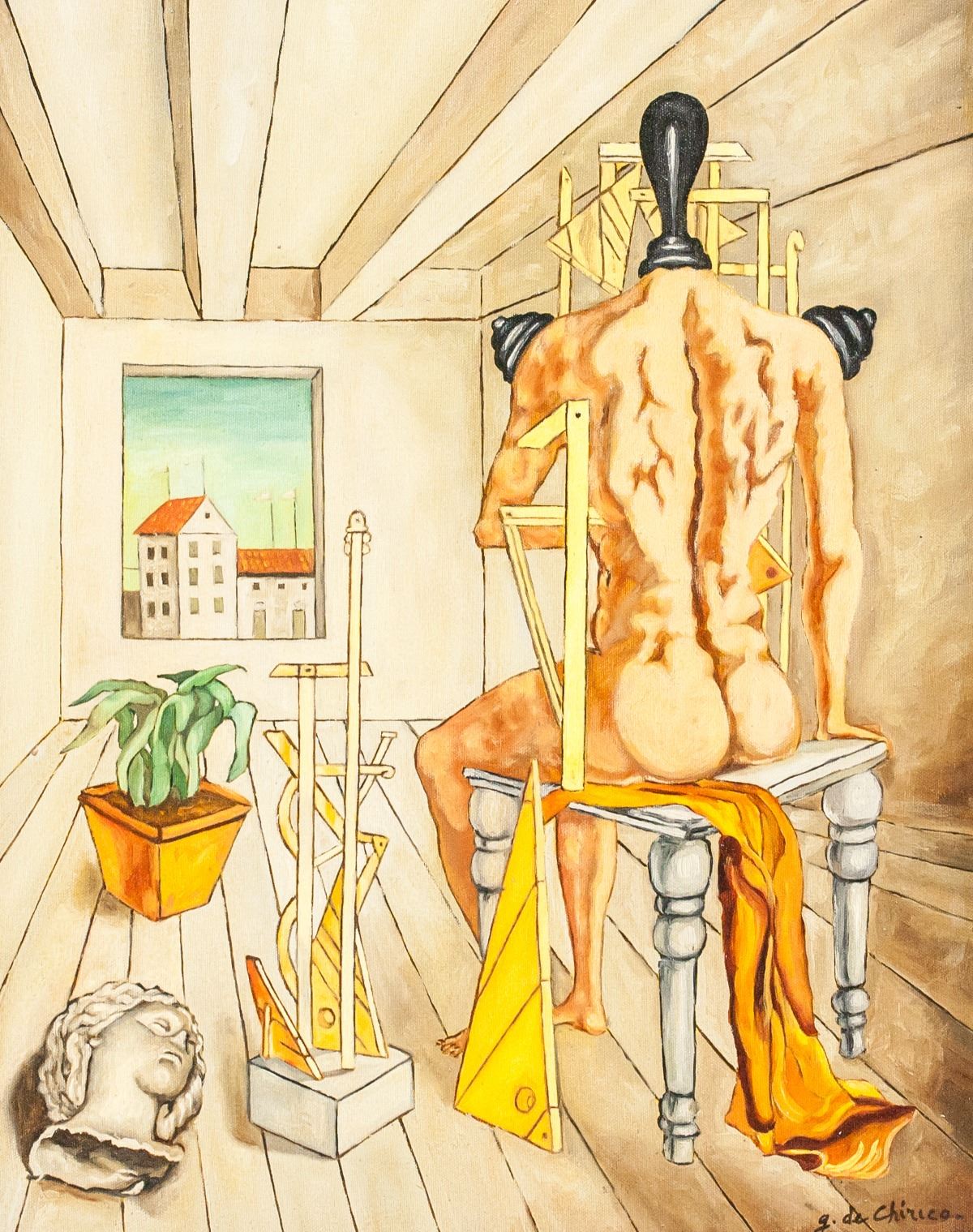 Oil on canvas, framed. Featuring surrealist composition of a person sitting on a chair with black light bulb-like object in place of a head. A carved statue head lies to the side. Signed "g. de Chirico" to the bottom right. "g. de Chirico" inscribed on verso. Label on verso reads "GALLERIA LA BUSSOLA / Giorgio De Chirico / Oile su Tela / No 70262". Stamped with "G. ZANINI ARTE CONTEMPORANEA" on label. Canvas size: 50 x 40.5 cm (19.75 x 15.8 inches). Frame size: 63 x 54 cm (25 x 21.5 inches).