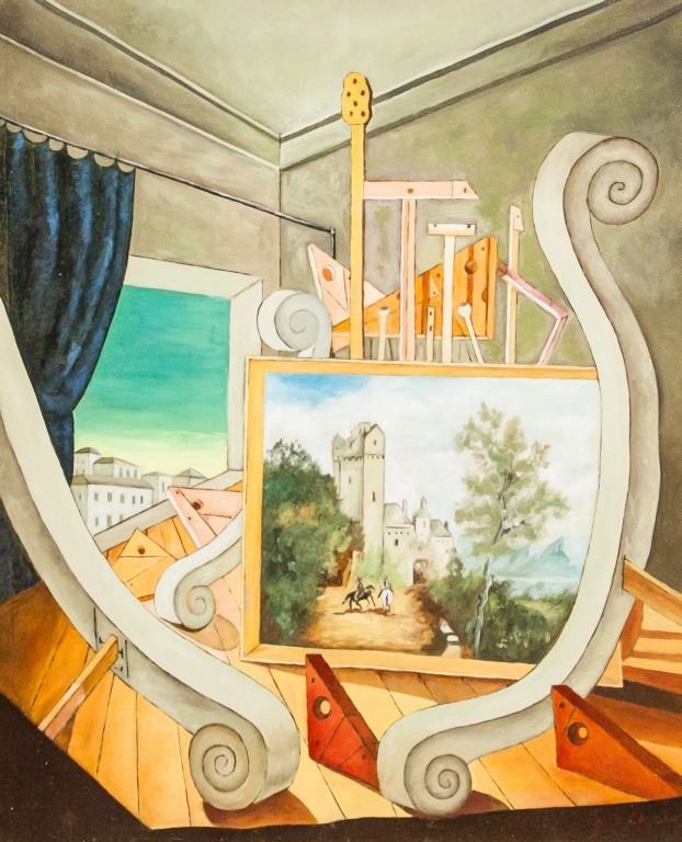 Oil on canvas, framed. Featuring a surrealist interior scene of a painter's studio and a painting within a painting. Signed g. de Chirico on the lower right corner. Label affixed to verso inscribed GALERIE SIMON / 29 bis, Rue d'Astorg / No. 17181 / Giogio de Chirico / huile sur toile / 23.5 x 18.5 in / PARIS. Canvas size: 60 x 50 cm (23.5 x 19.7 inches). Frame size: 77 x 67 cm (30.5 x 26.5 inches). Provenance: This lot carries limited provenance from a Private Italian collection