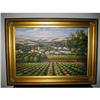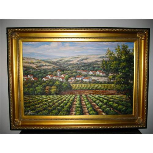 This Exquisite painting with georgious designer frame is Italian representing a winery and cottages in Italy. The painting is breath taking. Vibrant colors and impacable detailed frame of gold and black. They are both in excellent condition and measuring 32.5 inch in height, 44.5 inch in width, and 2 inch in depth on the frame. Taking 6.5 inch from each side, and it will be the measurement for the painting itself. Signature of the artist is on the lower left side (image #2 & 3). This painting is lovely!