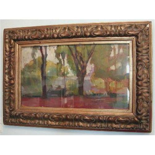 Charming Italian oil painting on board, depicting a park scene c.1930's. This piece is in excellent condition and is behind glass, with original frame. The piece is unsigned. Came from an Italian estate. Frame is in very good condition except for a small chip top left corner, and a small 1" repair top left, about 1" down. Art size measures 13.5W x 7.5H.