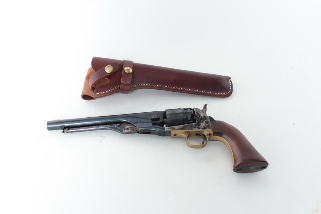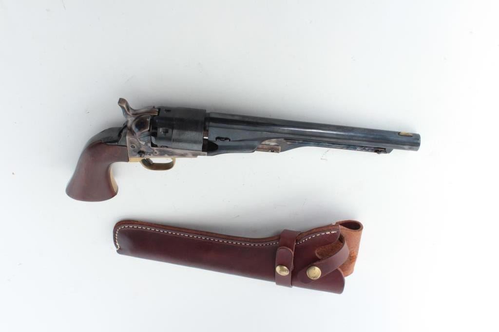 Army percussion revolver, .44 caliber, blued and case hardened finish, wood grips, S/N 32590, in near new condition and accompanied by a brown leather holster. (Percussion). Est.: $125-$250.