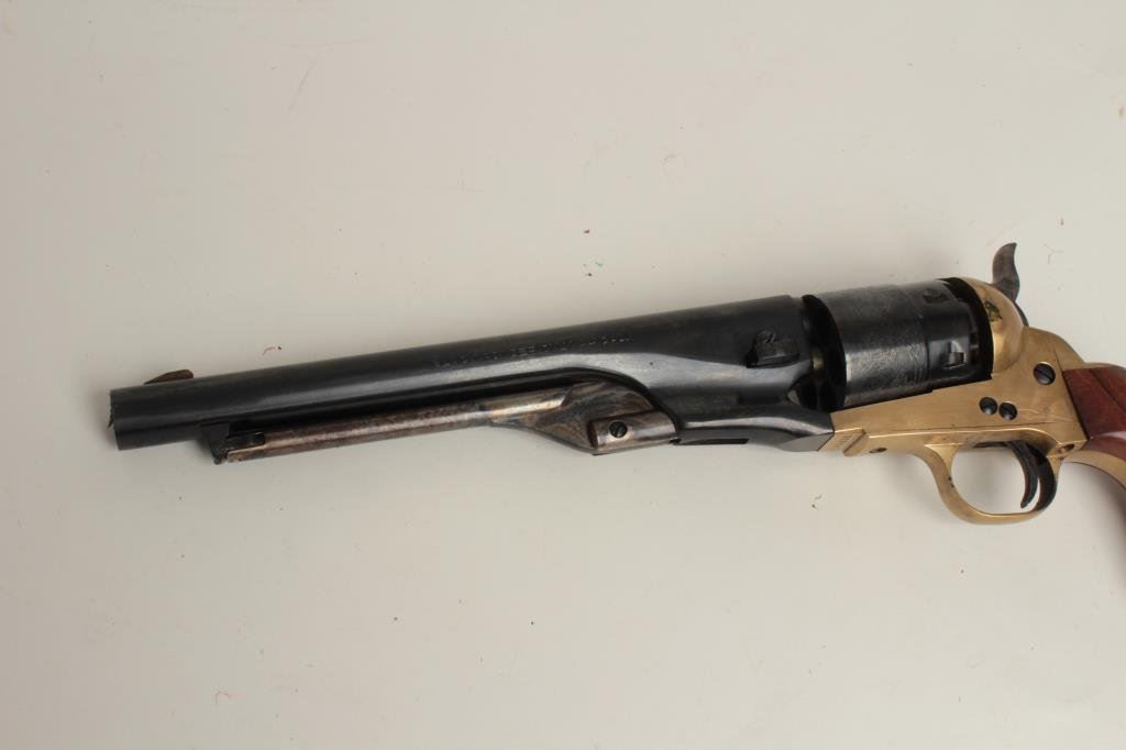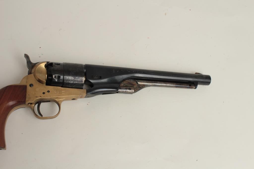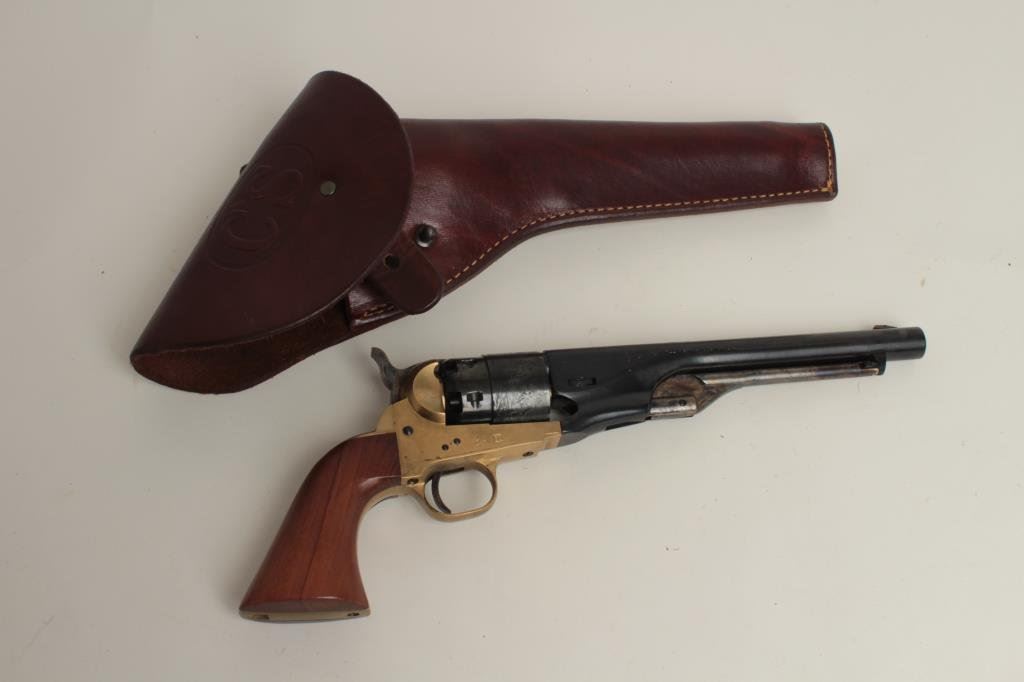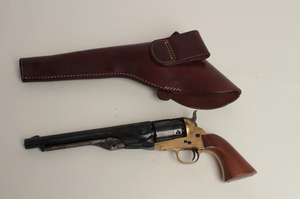 Army revolver, brass frame, blued and case hardened finish, wood grips, S/N 342255, in near new condition and with a Cabela’s brand “CS” marked brown leather holster. (Percussion). Est.: $125-$250.