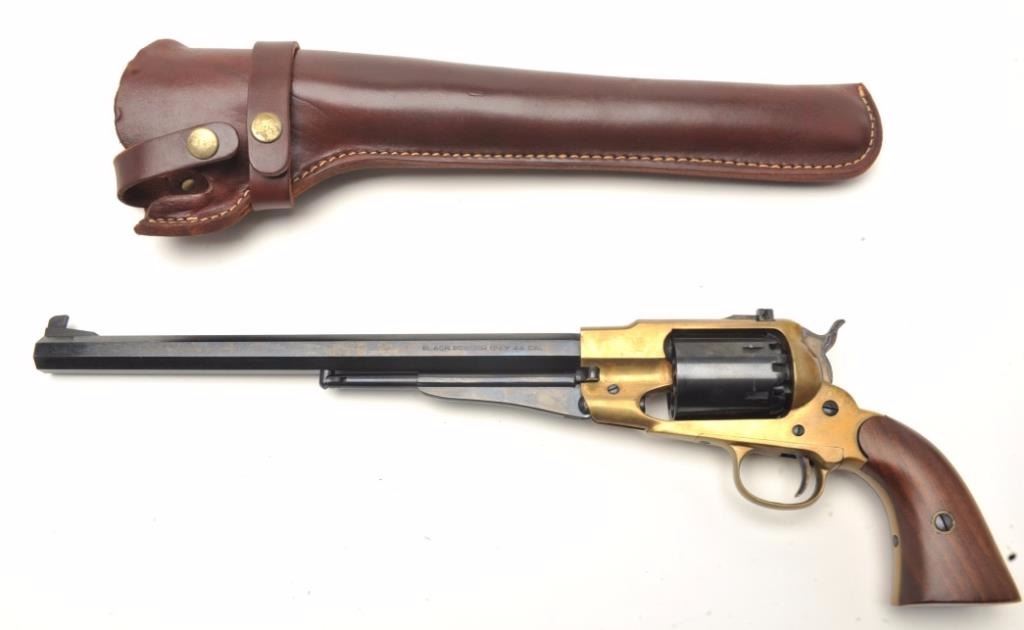 1858 revolver, .44 caliber, 12” “Buntline” length octagon barrel, brass frame, blued finish, wood grips, S/N 175775, in near new condition with accompanying brown leather holster. (Percussion). Est.: $175-$350.