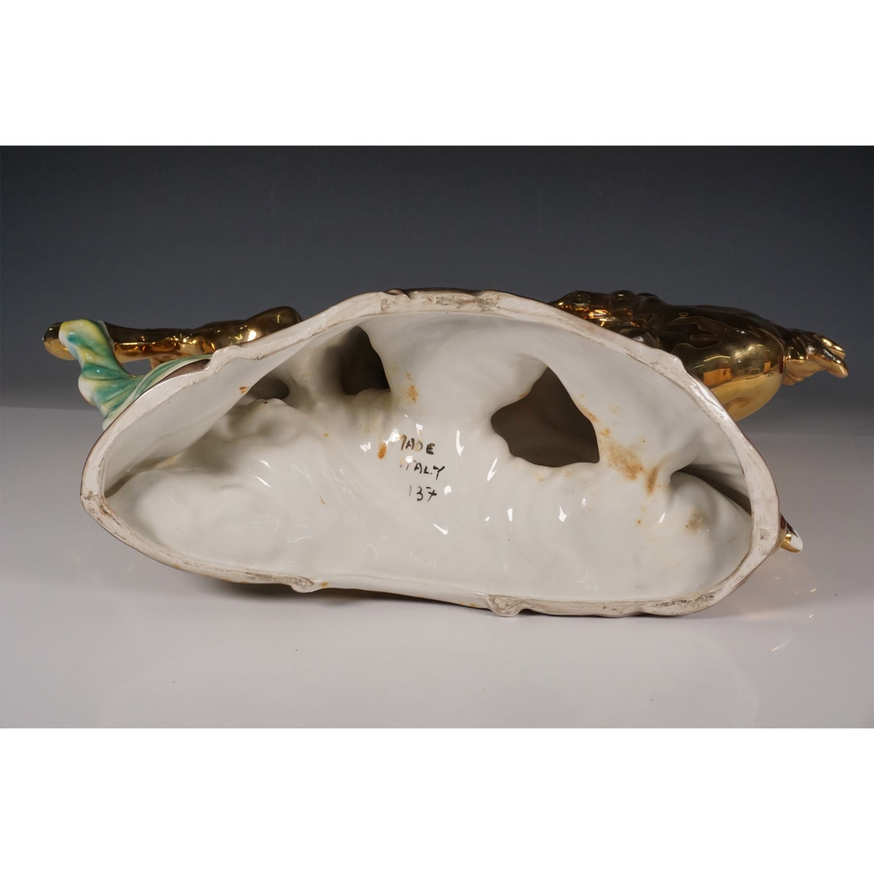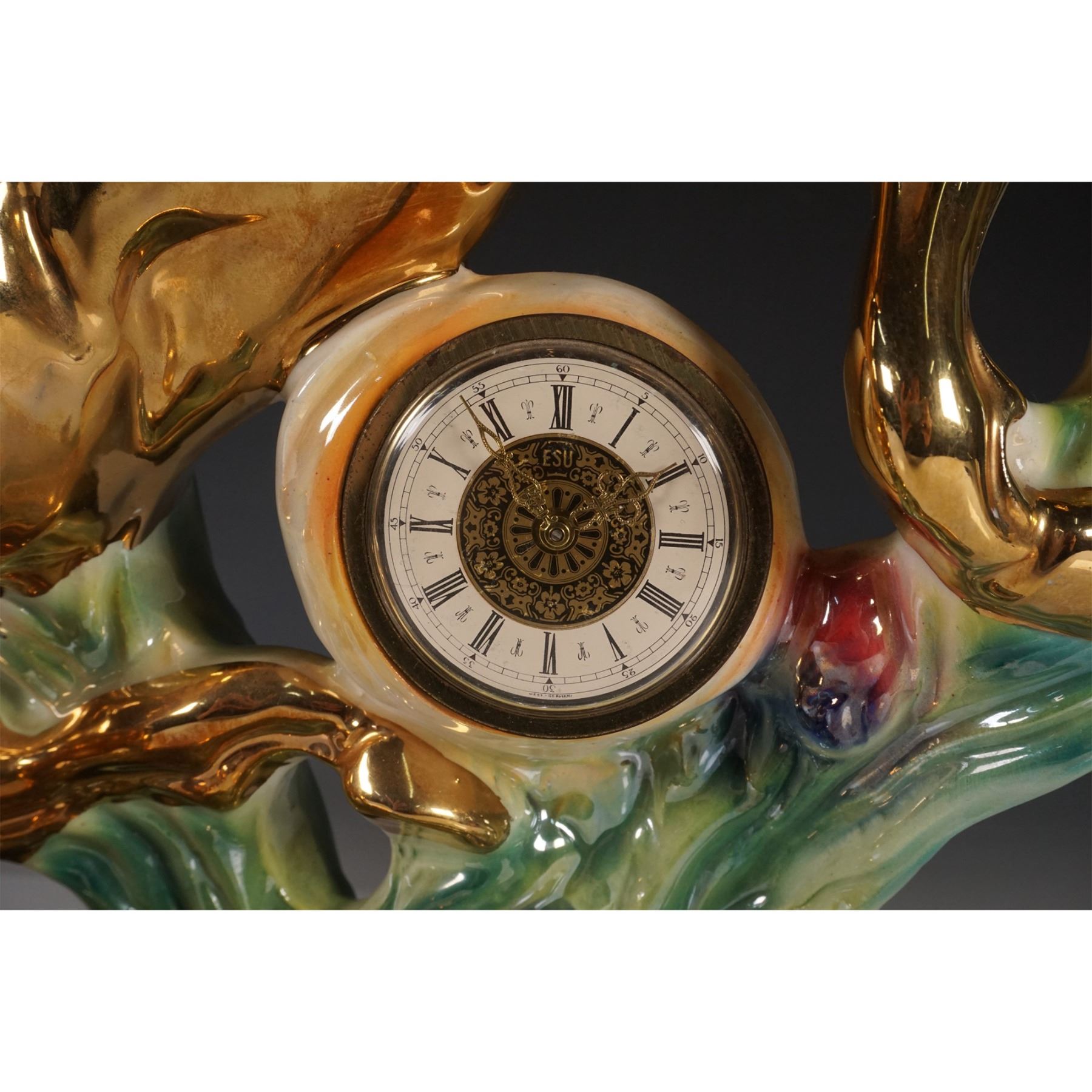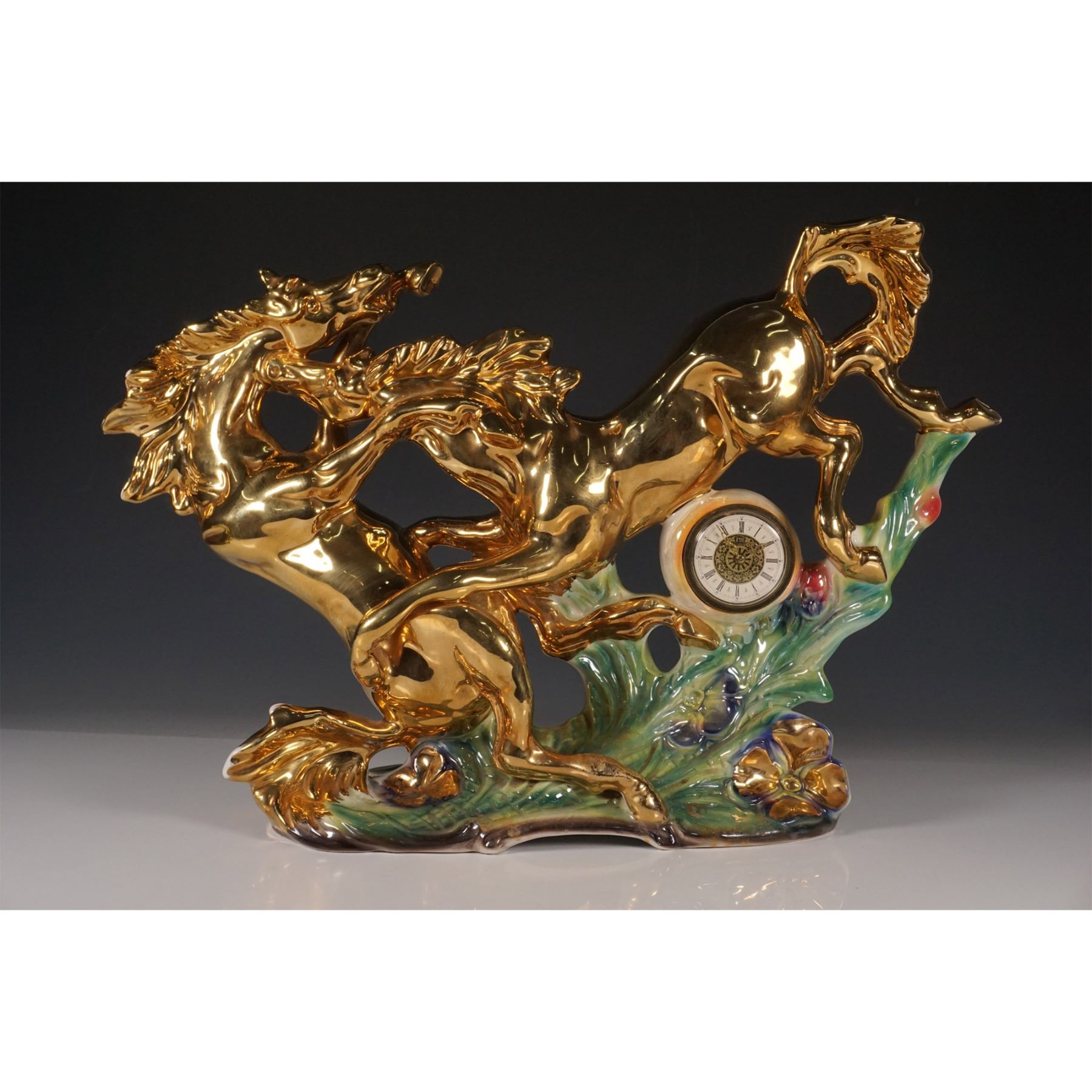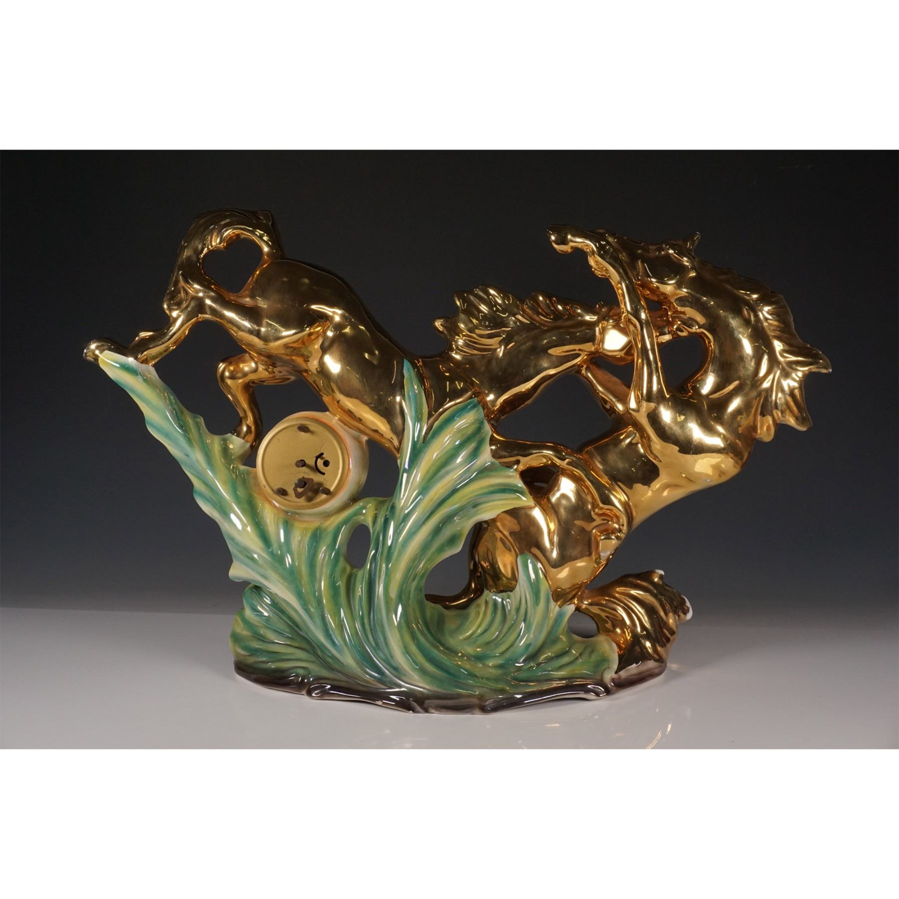 A striking porcelain figurine depicting two rearing horses, mounted with a clock in the center, created in Italy. The clock features a classic Roman numeral dial with an ornate brass design and is marked Made in Italy with the model number 137 on the base. The horses are elegantly sculpted in glossy golden finish, with beautifully shaded green and blue porcelain accents around the base that simulate waves or foliage. This piece combines artistry with functionality and would make an eye-catching addition to any collection.